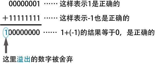 接下来我们将 - 1 表示成 11111111 来试试看(正确的方法)。“00000001 + 11111111”的结果正好是 0(= 00000000)。在这个运算中,最高的第 9 位的数字溢出了,我们之前讲过,计算机会舍弃溢出的数字,因此在 8 位范围内计算的话,100000000 这个 9 位二进制数就会变成 00000000( 图 2-7 )。