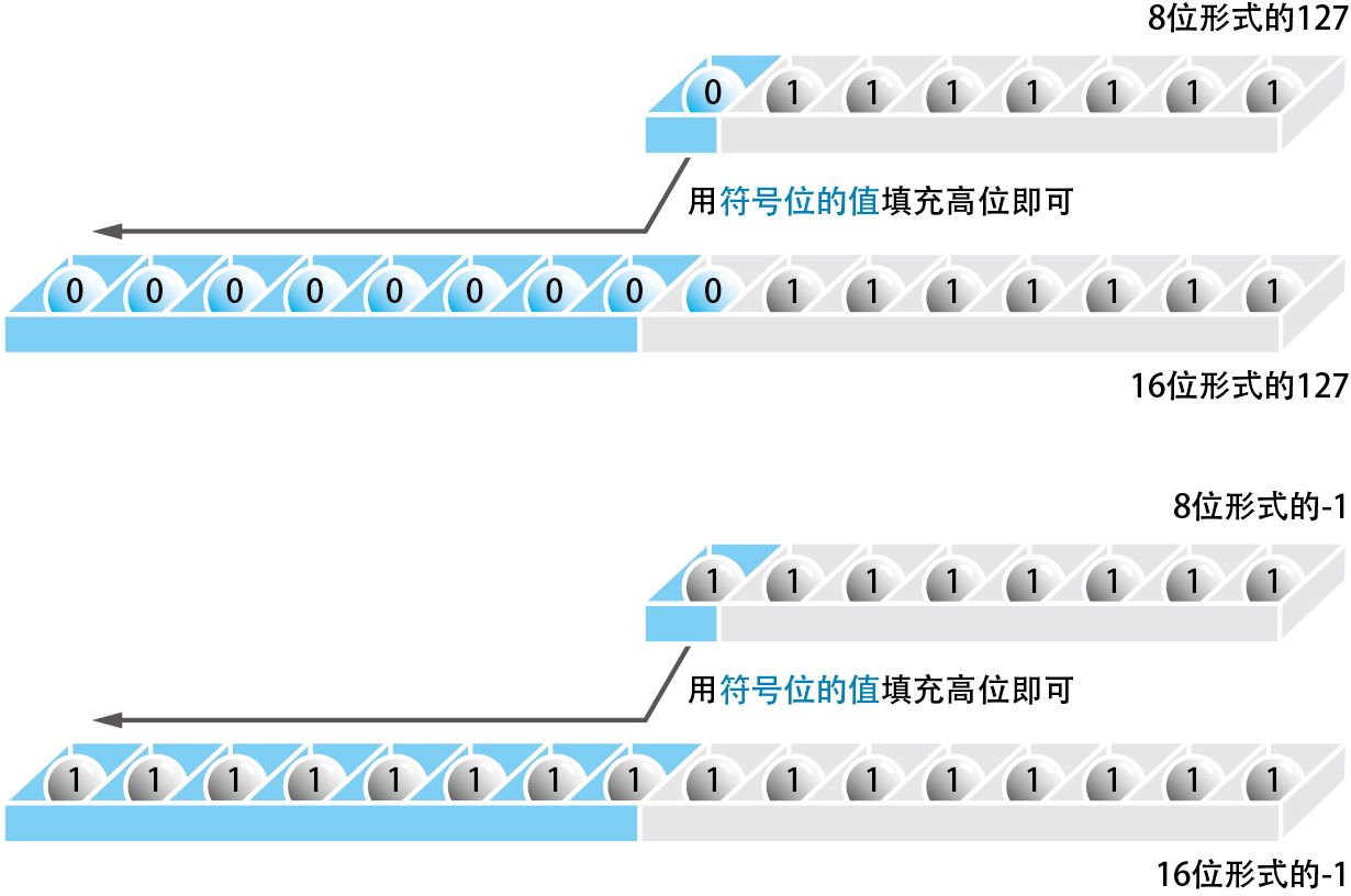 这里还要介绍一下 符号扩展 (sign extension)。当我们要将一个 8 位二进制数在不改变其值的情况下转换成 16 位二进制数或者 32 位二进制数时,就需要使用符号扩展。将 01111111 这样的二进制正数转换成 16 位就是 0000000001111111,这种情况很容易处理,但如果是像 11111111 这样的以 2 的补码表示的负数,该怎样转换呢?其实,转换方法很简单,只要写成 1111111111111111 就可以了。无论是正数,还是以 2 的补码表示的负数,进行符号扩展时都只要用符号位的值(0 或 1)填充高位即可,也就是将符号位直接扩展到高位( 图 2-11 )。