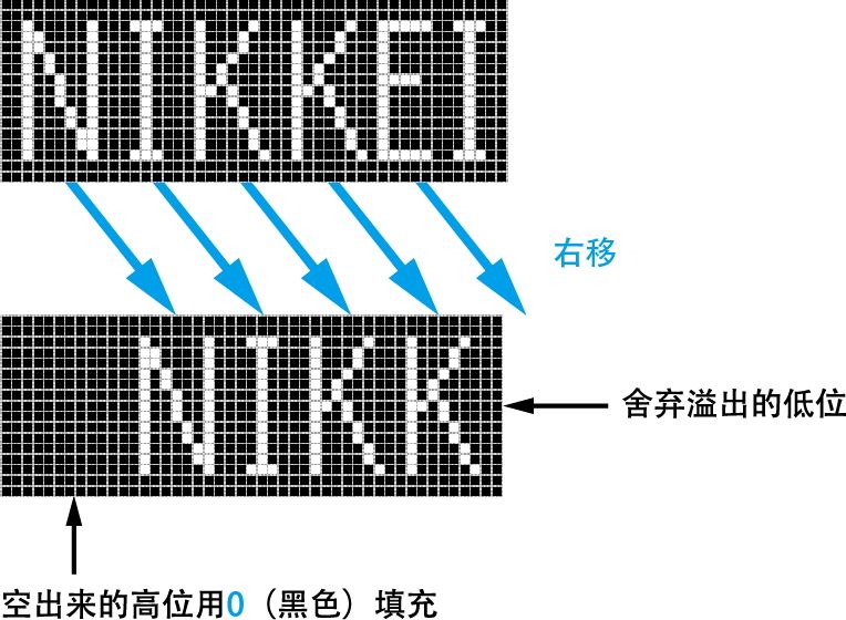 理解了 2 的补码之后,我们再回到右移运算这个话题。之前讲过,在右移运算中,移动后空出来的高位有用 0 填充和用 1 填充两种情况。如果将二进制数想象成图案而不是数值,在右移时就会用 0 来填充高位,就像图案在霓虹灯牌上向右滚动的感觉,这种做法称为 逻辑右移 ( 图 2-9 )。
