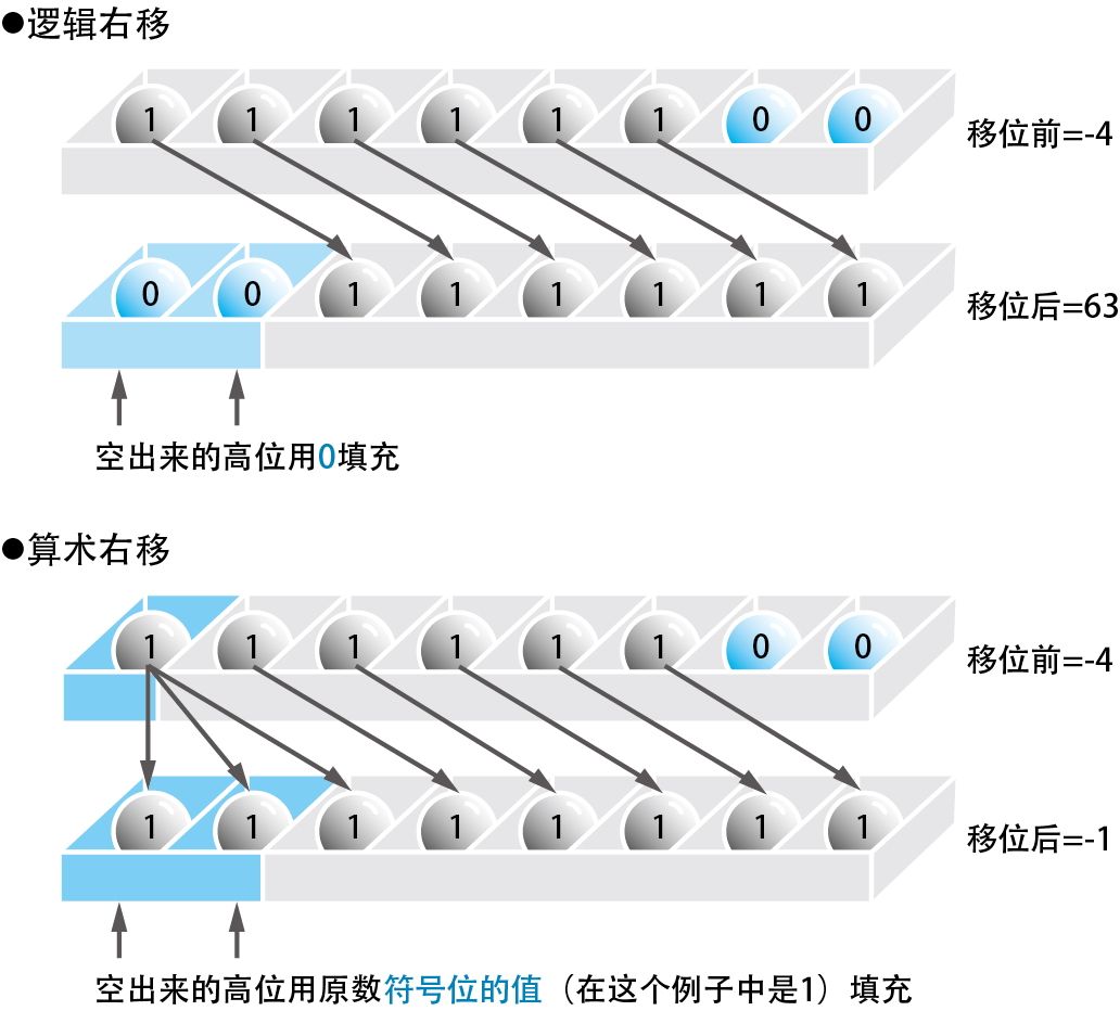 下面我们来看一个右移运算的例子。假设我们要将 - 4(= 11111100)右移 2 位,如果是逻辑右移,结果就是 00111111,即十进制的 63。但是,这个结果并不是 - 4 的 1/4,如果用算术右移,结果就是 11111111,正好是以 2 的补码表示的 - 1,这样我们就能正确计算出 - 4 的 1/4 了( 图 2-10 )。