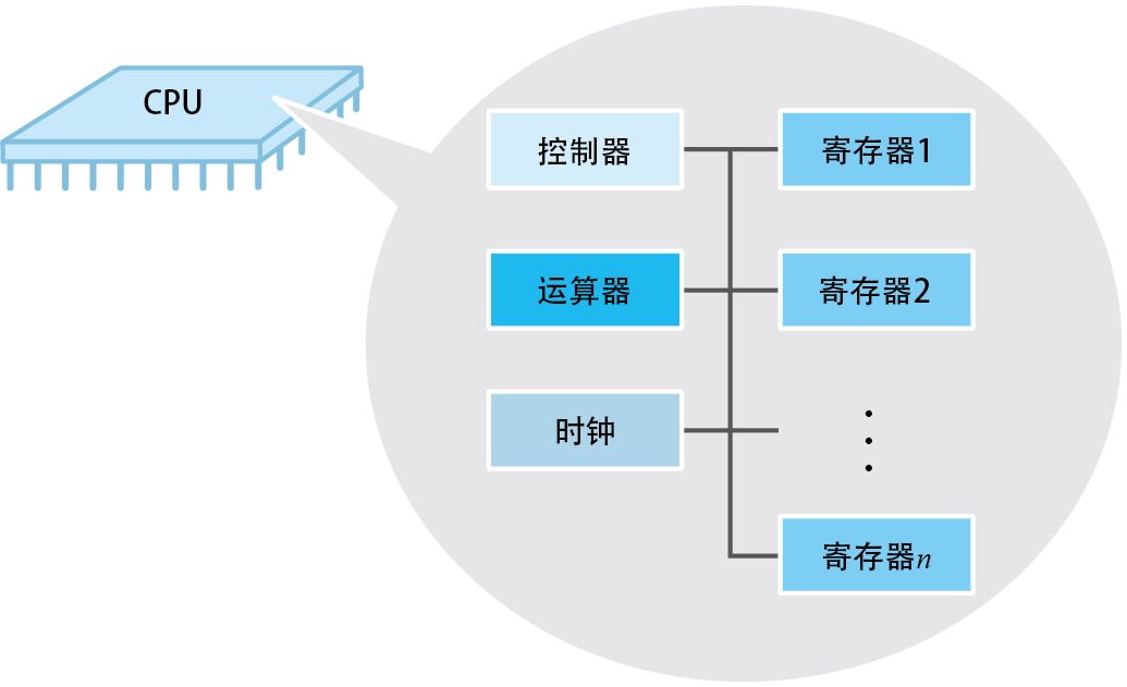 所示,CPU 内部是由寄存器、控制器(control unit)、运算器(arithmetic unit)和时钟(clock)四个部分组成的,它们之间通过电流信号相互连通。