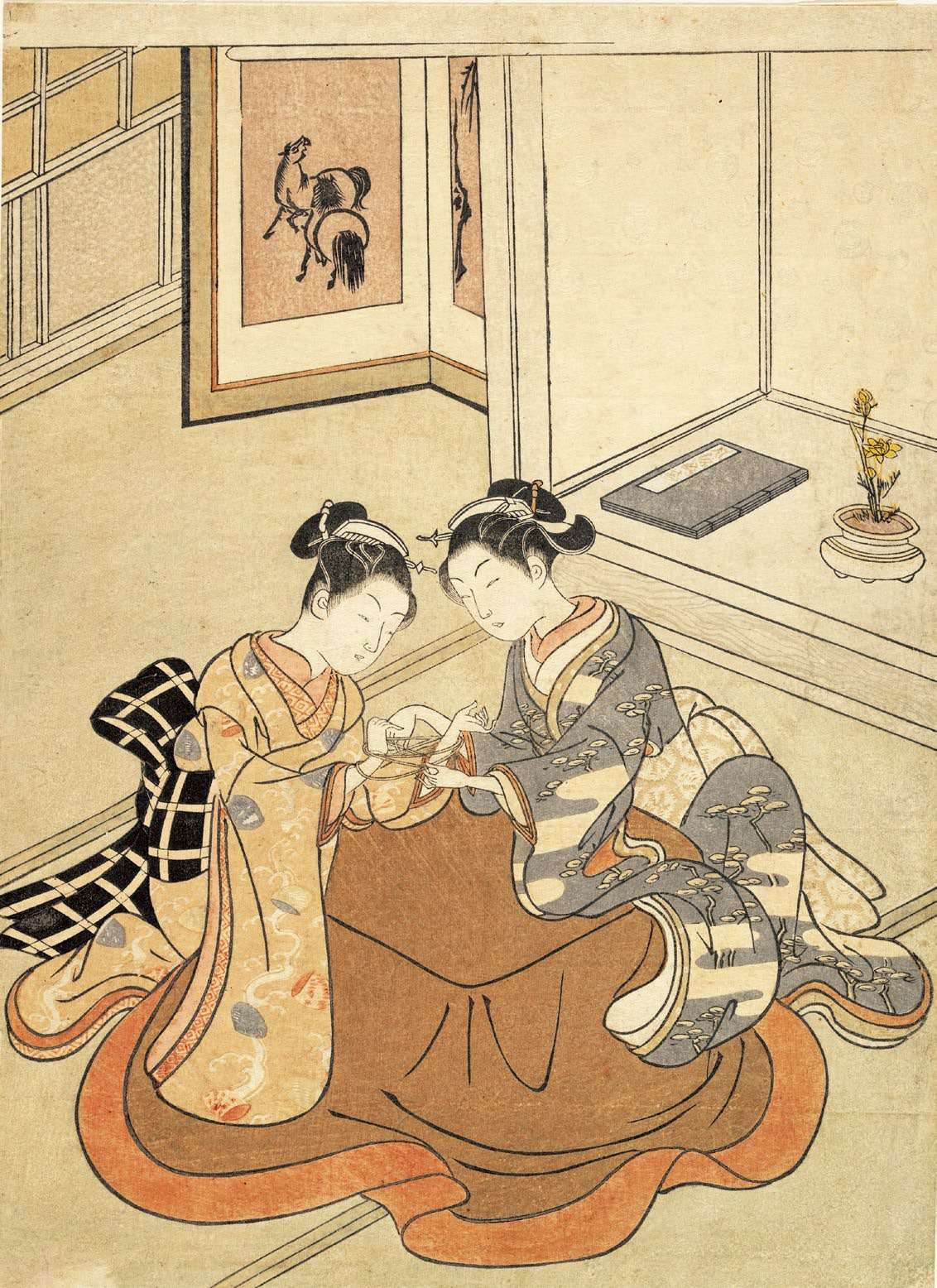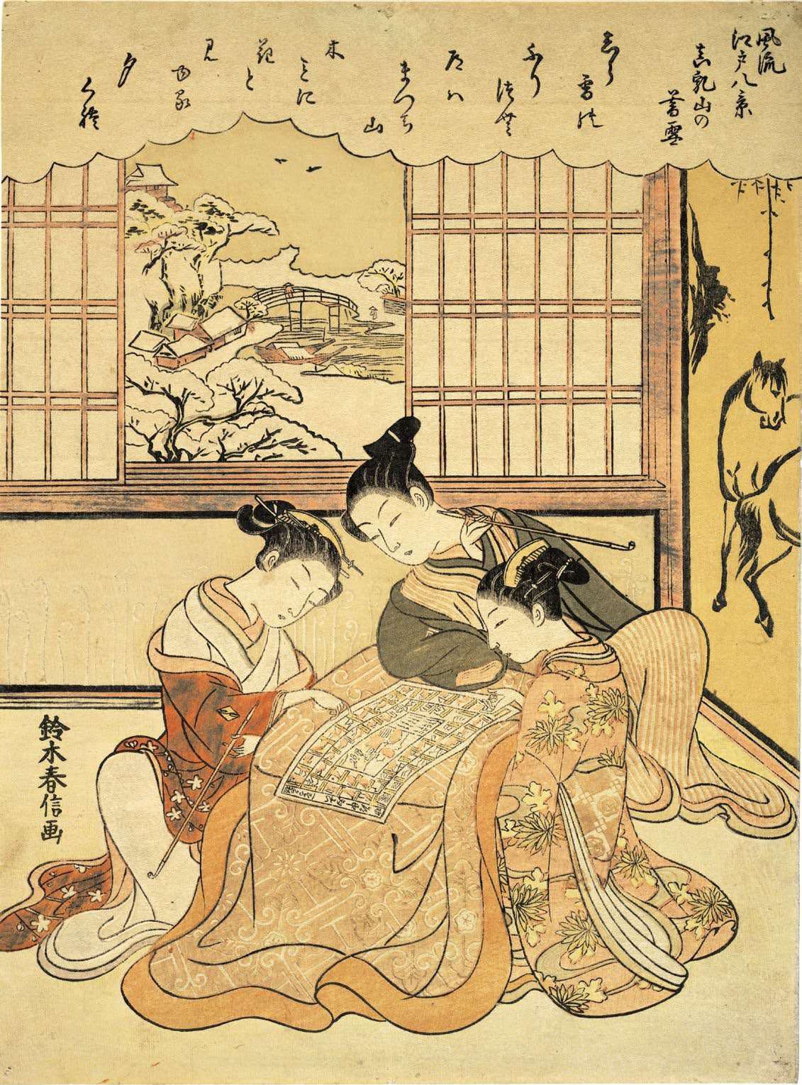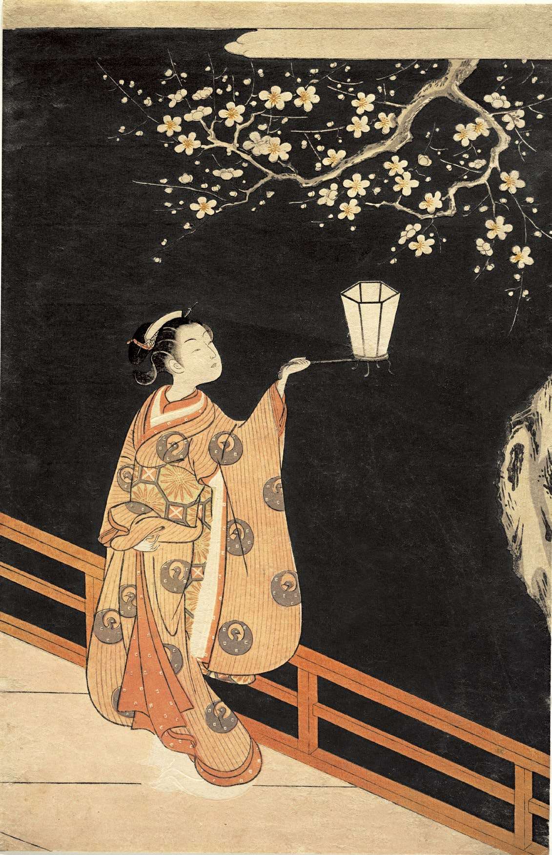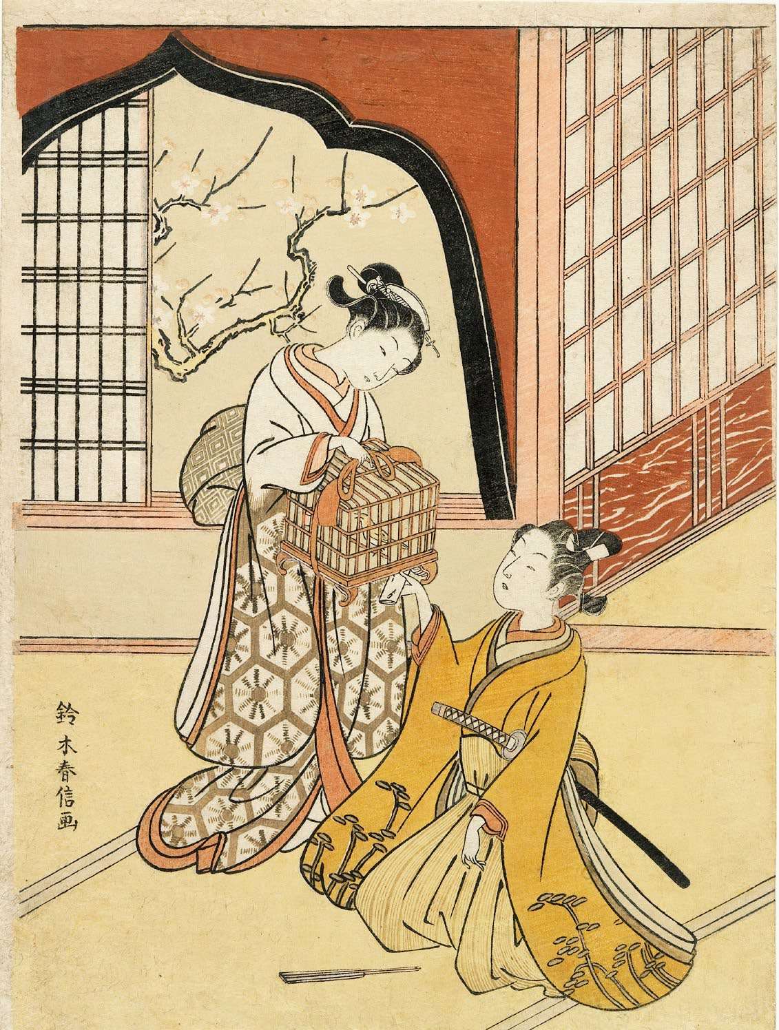 尝言:“春信用色皆甚朦胧,彼无意在对比中寻求色彩之效果,毋宁说,更致力于从光影之调和与中间色之用法中去获取此一效果。”Perzynski(佩金斯基)