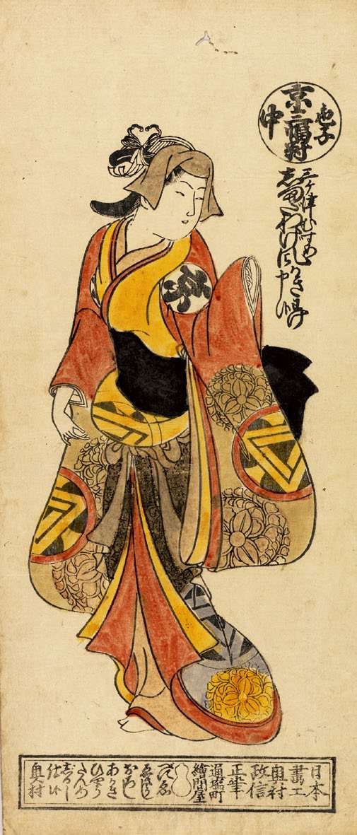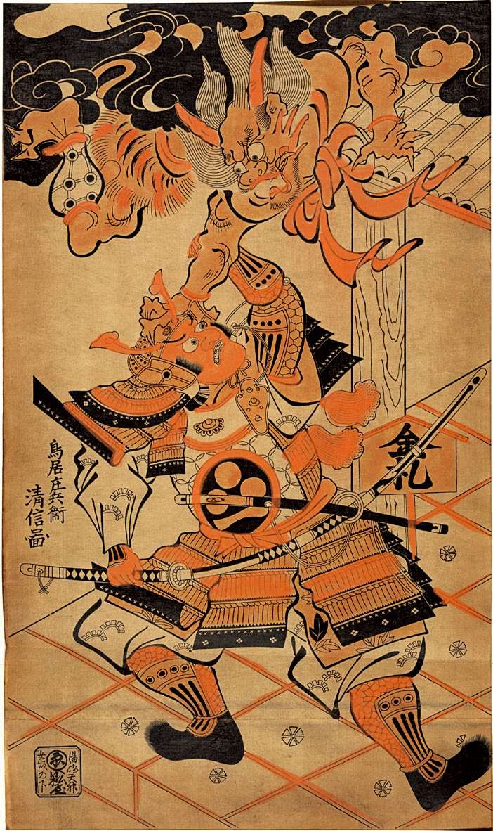 版刻,因菱川师宣的版画及书籍插画而渐次成熟,迨及鸟居派初期的役者绘的问世,越发顺应民间的需求,遂得以与江户戏剧一并获得其进步与发展。不过,当时的版画均为单色的墨色拓印,以黑白两色的对照为主,虽也添加以朱红及黄色、褐色等,但多是在墨色拓印之后,另行添笔补色,故而想必还无法称其为纯然的彩色雕版印刷物。像这样的手工雕版印刷工艺,至享保年间,则被称作漆绘,即在墨色之上用力敷以矾水,致使其更显光泽,并进而敷以泥金而增添其华美。其后不久的宽保二、三年,奥村政信门人西村重长