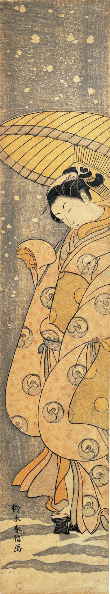 自明和二年始,春信用众多版木研制出的锦绘,乃是当时制作中最为上乘的作品,故而据说在法国的浮世绘收藏家中,便有专注于收集仅限于明和二年版的春信作品的。见之于翌年,即明和三年制作中的背景即已渐趋复杂;明和四年的作品则采用厚重的褐色(代赭色),成为其版画的特征,而人物(女子)鬓发的渐次高绾并趋于蓬松,也出现于这一年;至五年,其画风越发变得纤细,在重新施用纯粹的红色的同时,通常还施以柔和的绿色,女子发型的顶端则被大幅拓宽,眼睛呈一直线,俨若一道从中横切的直径;六年之制作,人物益发变得修长,脸部亦变长,其鼻子则被放大至有失权衡的地步;七、八年,非但鼻子,人物的头部也被画成又长又大的模样。此非春信单独如此,乃是该时期带有春信画风的画家们的普遍倾向,想必正是基于时代风俗的变迁。而在该时期的春信版画中,正如这幅《雪中相合伞》所呈现的,通常是由黑白两色对照所构成的浓重色彩。