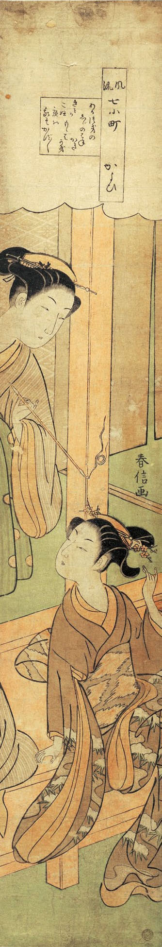 接下来当作记述的是柱绘。被称作柱绘的、画幅极为狭长的版画款式,据费诺罗萨研究称,延享二年顷,即在鸟居清重作品中见有其实例,但实际用以悬挂于立柱,则还是之后的事。这一款式与方正而平易的版画的不同,想必是画工必须自行具备别出心裁的匠心设计。如今,描绘人物时,为呈现其全身于柱绘,便势必非将人物缩小不可,如此一来,画面上下想必会生出空虚。于是,寻觅到设计出特殊的构图,以便足以适应于这种特别的款式的画工的一番苦心的印迹,也便成了最有兴味的一件事。铃木春信便是明和年间促成柱绘得以流行的画家。他将游女