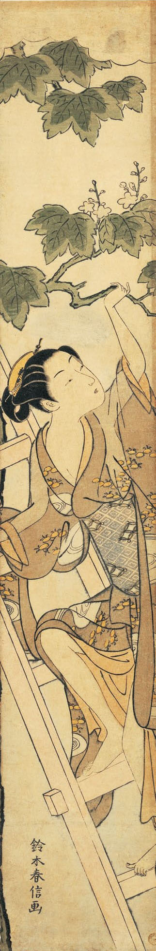 伫身侧面的姿态描摹在狭长的纸面上,使之成为呈现女子窈窕风姿的最为恰当的形式;或者是画一张正在回视顾盼的美少年的脸,凭借其仅能见出半截的风流身段,便使袅袅余韵巧妙地溢于纸外;而画梯子上攀上蹬下的女子,衣服下摆处裸露出一截秀美的腿胫,想必应该是一则最适宜于柱绘的极香艳的绘画题材了;以狭长的画面的上部作为楼阁,一对男女则邂逅于楼梯,这样的场景亦殊不恶。到了春信的后继者湖龙斋那里,柱绘越发地丰富多样,所选题材也越发地妖艳淫靡。