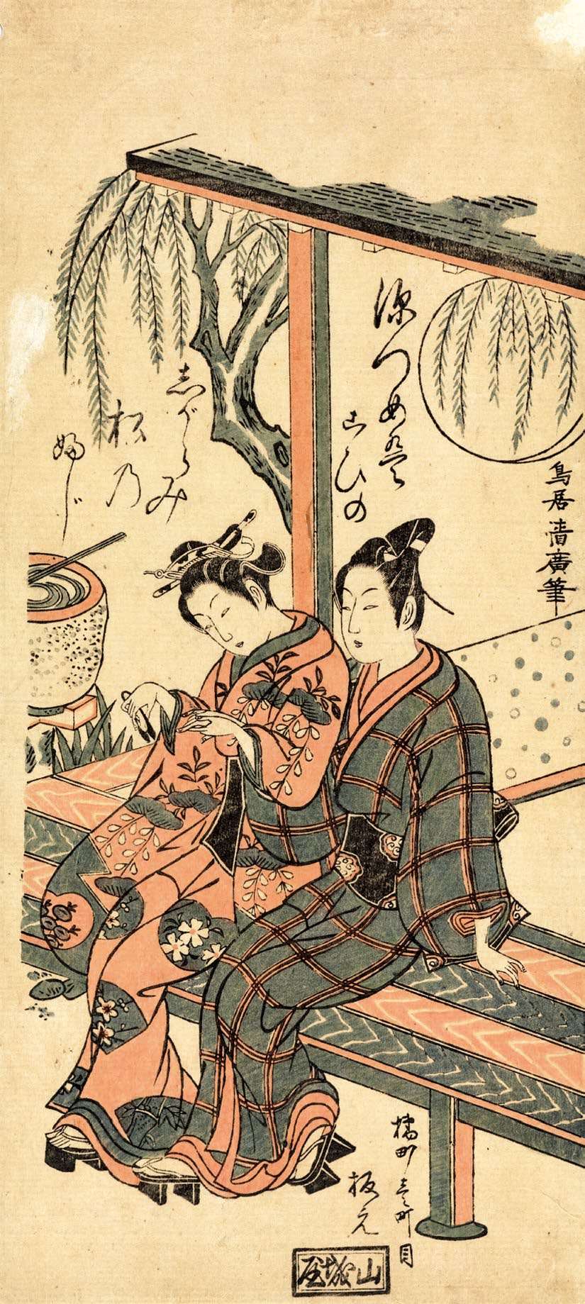 如此,则始于宽保三、四年间的双色印刷版画,不过数年工夫,至宝历元年顷,便已于不知不觉中,凭借从绿红中分解出绿色而制作出黄色,又于红色之上印刷以蓝色(青)而得到紫色,由此完成了三色套印的工艺。这一工艺最初究竟由何人所研制虽已无从判明,然而在宝历元年顷鸟居清满制作的版画中,其用法即已尤为明显和巧妙,故而最近欧美的研究者,即普遍视清满为促成双色、三色套印工艺之进步的有功之臣。于红、绿二色之间点缀以蓝(青),色彩之和谐并未受损,却巧妙地使其画面变得丰富,这便是清满版画的特征。清满最初用一种发灰的混浊的蓝色,以保持色彩的谐调,整幅画面则借助于褐色而使红、绿变暗,并使其蓝色黯然变成橄榄色,诸如此类,常常在蓝色的应用上显得煞费苦心,相反,在原汁原味地使用纯粹蓝色一事上,后起的春信才显得更为果敢,以致清满也不得不对其仿而效之。