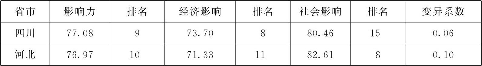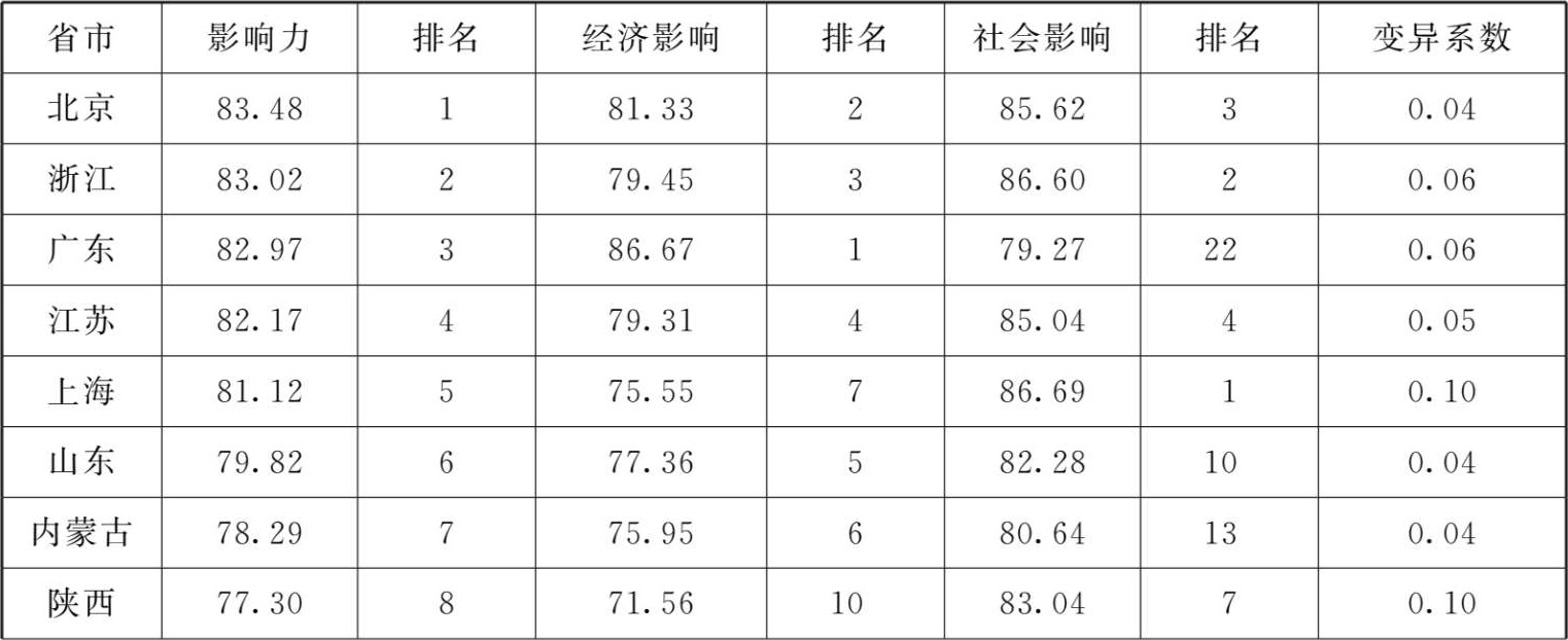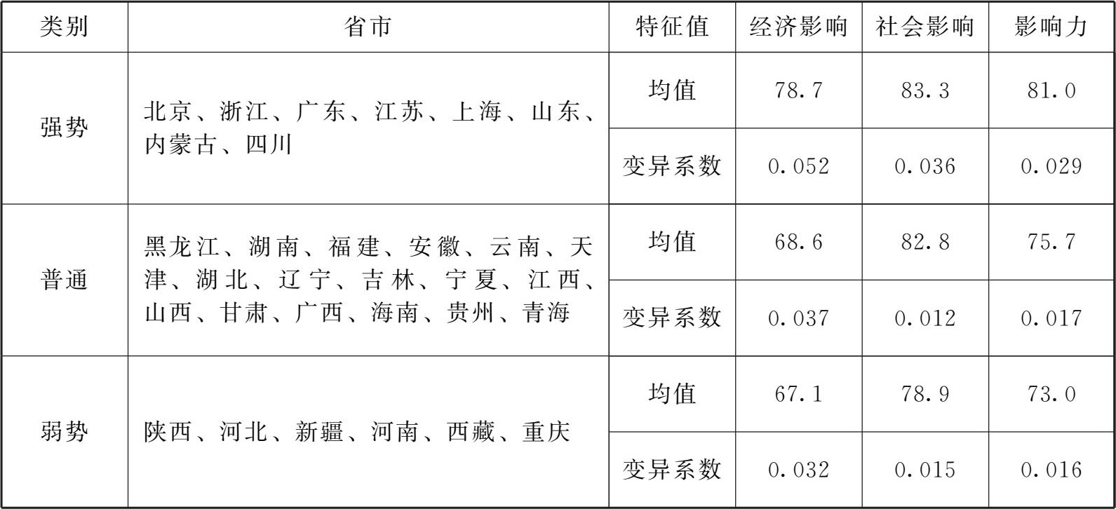 聚类分析以影响力指数为基本信息,对经济影响、社会影响两个要素指数进行聚类,聚合为三类时达到较好的组间区分。第一类为北京、浙江、广东、江苏、上海、山东、内蒙古、四川,其影响力指数最高,经济影响要素指数有非常明显的优势,但均衡度较差,这里将其定义为强势地区。第二类包含黑龙江、湖南、福建、安徽、云南、天津、湖北、辽宁、吉林、宁夏、江西、山西、甘肃、广西、海南、贵州、青海,其影响力指数和经济影响、社会影响要素指数一般,均衡度一般,此处将其定义为普通地区。第三类包含陕西、河北、新疆、河南、西藏、重庆,其影响力指数和社会影响要素指数较低,均衡度一般,此类省份在整体上处于弱势,这里将其定义为弱势地区(见表2-6)。
