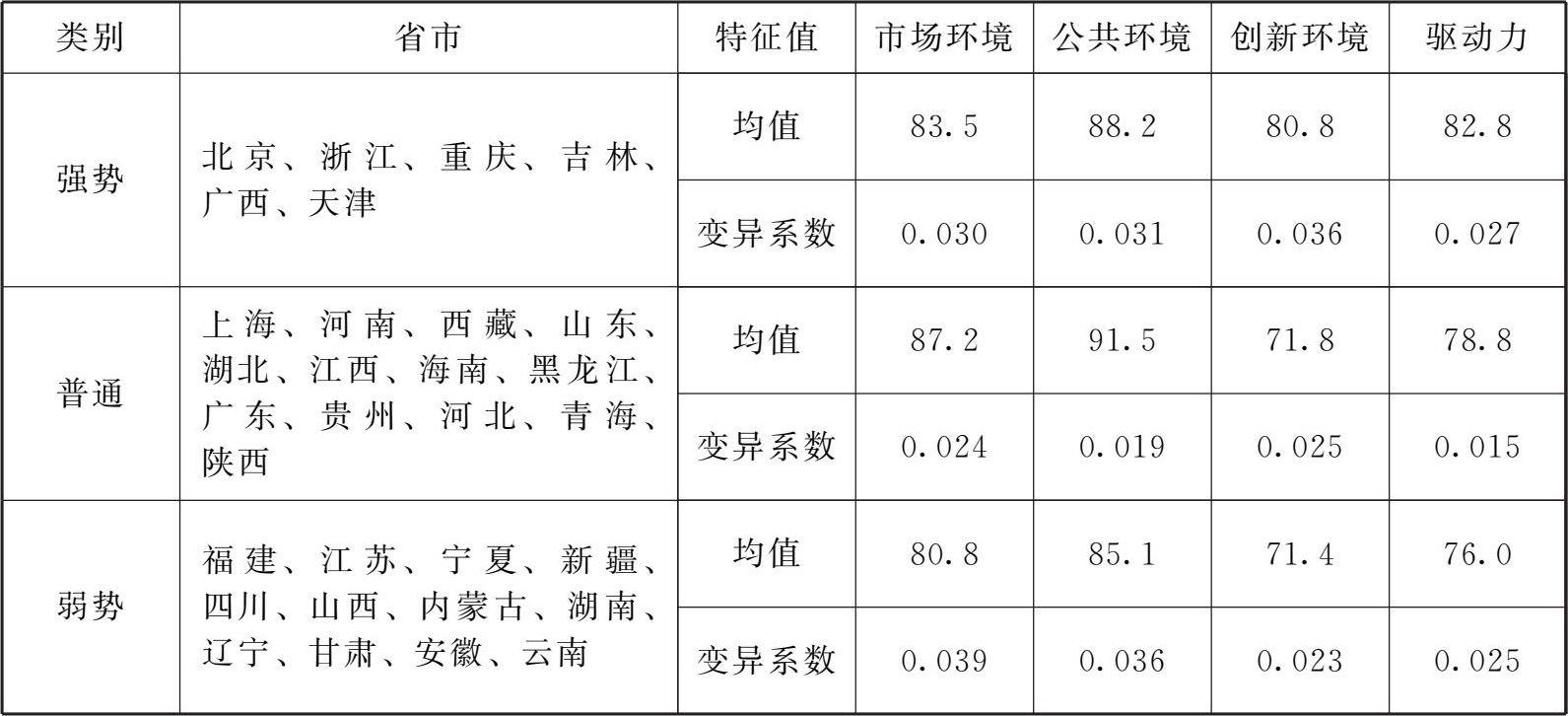 聚类分析以驱动力指数为基本信息,对市场环境、公共环境、创新环境三个要素指数进行聚类,聚合为三类时达到较好的组间区分。第一类为北京、浙江、重庆、吉林、广西、天津,其创新环境指数具有非常明显的优势,这里将其定义为强势地区。第二类为上海、河南、西藏、山东、湖北、江西、海南、黑龙江、广东、贵州、河北、青海、陕西,其市场环境和公共环境要素指数较好,创新环境要素指数一般,均衡度较好,此处将其定义为普通地区。第三类包括福建、江苏、宁夏、新疆、四川、山西、内蒙古、湖南、辽宁、甘肃、安徽、云南,这些省市各要素指数均较低,在整体上处于弱势,这里将其定义为弱势地区(见表2-8)。