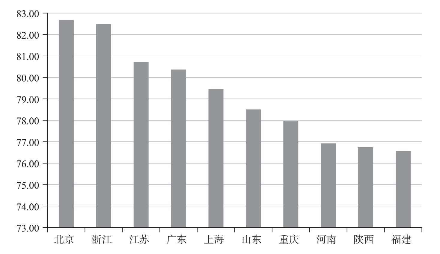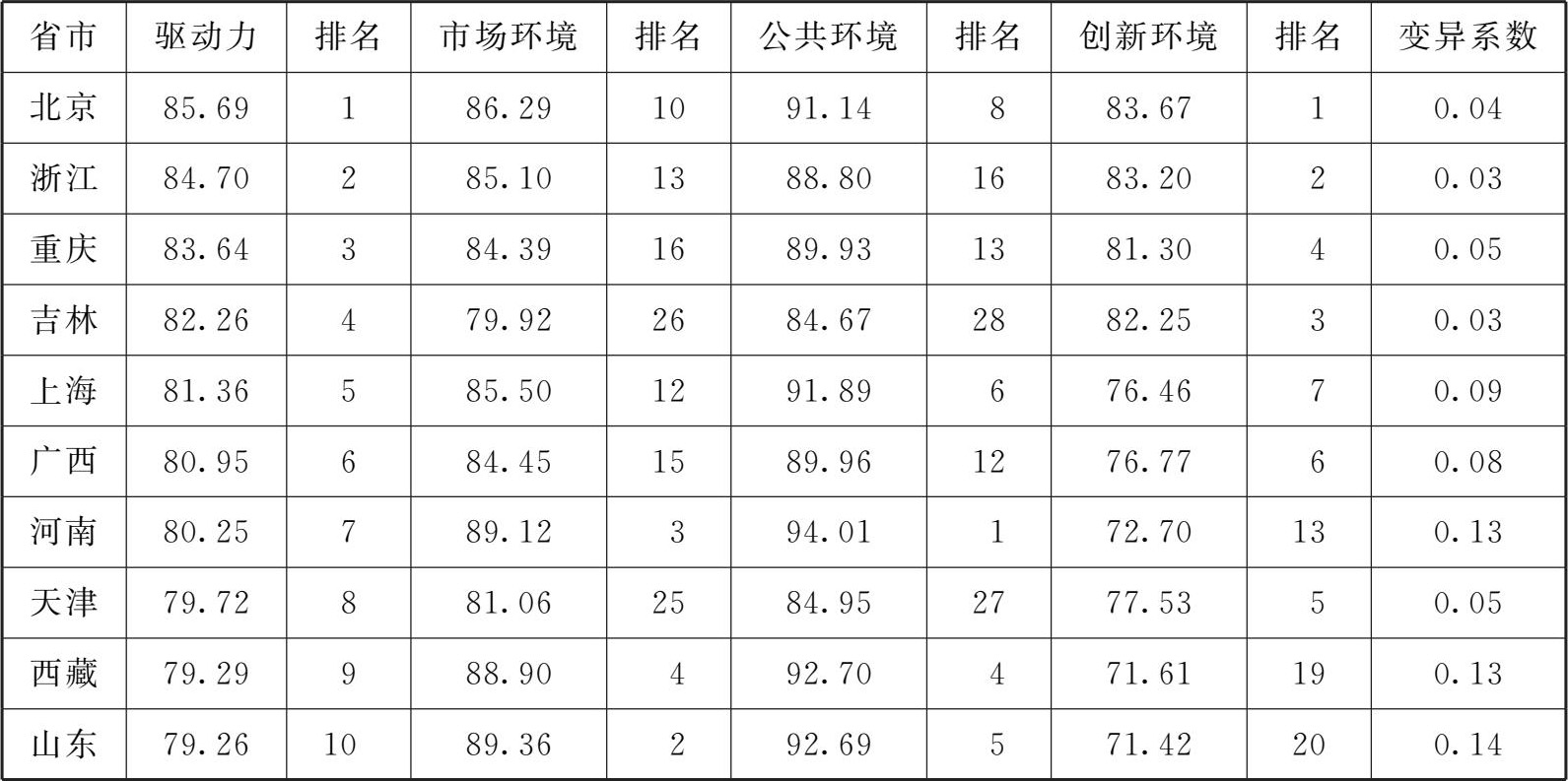 全国各省市文化产业驱动力指数变异系数适中,均衡度较好。相比市场环境指数和公共环境指数,创新环境指数相对偏低,均值只有73.36,未来各省市可以通过进一步提高科学技术,营造更好的创新环境,促进文化产业驱动力进一步提高,使发展更加均衡稳定。