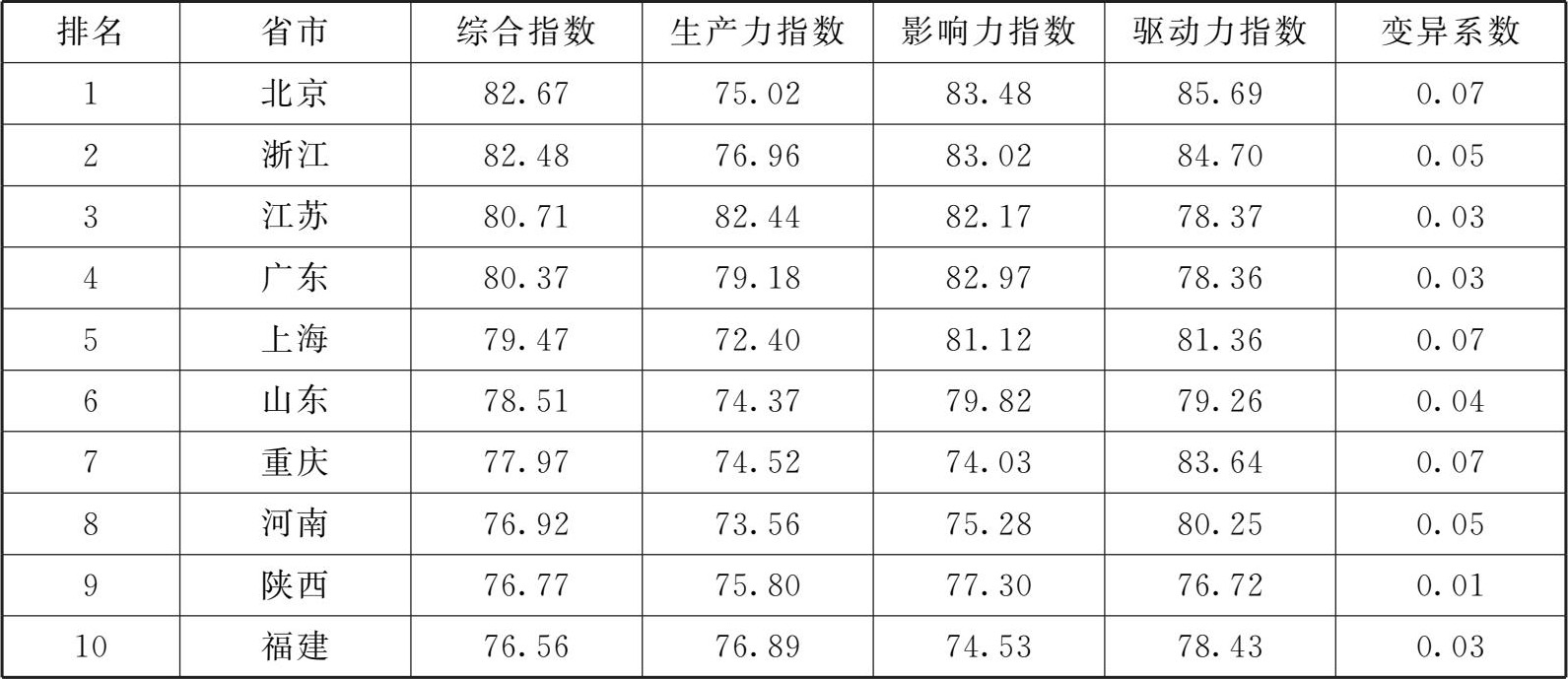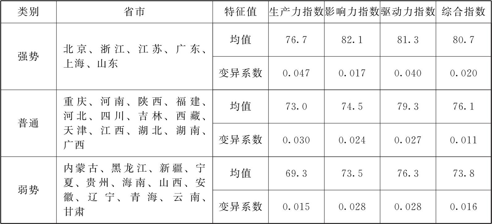 聚类分析以发展指数为基本信息,对生产力、影响力、驱动力三个要素指数进行聚类,聚合为三类时达到较好的组间区分。第一类包含北京、浙江、江苏、广东、上海、山东,这些省市综合发展指数最高,虽然一级指标的均衡度一般,但生产力指数、影响力指数、驱动力指数均值相较其他地区优势明显,这里将其定义为强势地区。第二类包含重庆、河南、陕西、福建、河北、四川、吉林、西藏、天津、江西、湖北、湖南、广西,其生产力指数、影响力指数和驱动力指数均处于中间区域,均衡度较好,此处将其定义为普通地区。第三类包含内蒙古、黑龙江、新疆、宁夏、贵州、海南、山西、安徽、辽宁、青海、云南、甘肃,其综合发展指数和各一级指标均值均较低,影响力指数和驱动力指数均衡度一般,影响力指数、驱动力指数与生产力指数相比有一定的分化趋势,此类省份在整体上处于弱势,这里将其定义为弱势地区(见表2-2)。