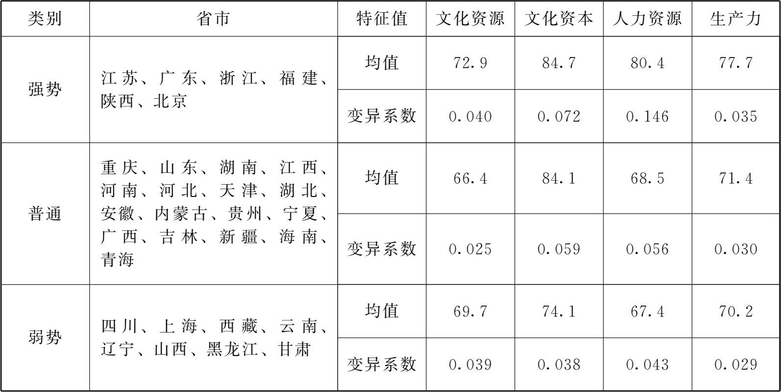 聚类分析以生产力指数为基本信息,对文化资源、文化资本、人力资源三个要素指数进行聚类,聚合为三类时达到较好的组间区分。第一类为江苏、广东、浙江、福建、陕西、北京,其生产力指数最高,人力资源要素指数有非常明显的优势,但均衡度较差,这里将其定义为强势地区。第二类包含重庆、山东、湖南、江西、河南、河北、天津、湖北、安徽、内蒙古、贵州、宁夏、广西、吉林、新疆、海南、青海,其文化资源和人力资源的指数一般,但文化资本有一定的优势,均衡度一般,此处将其定义为普通地区。第三类省市各项指数均较低,均衡度一般,此类省市在整体上处于弱势,此处将其定义为弱势地区(见表2-4)。