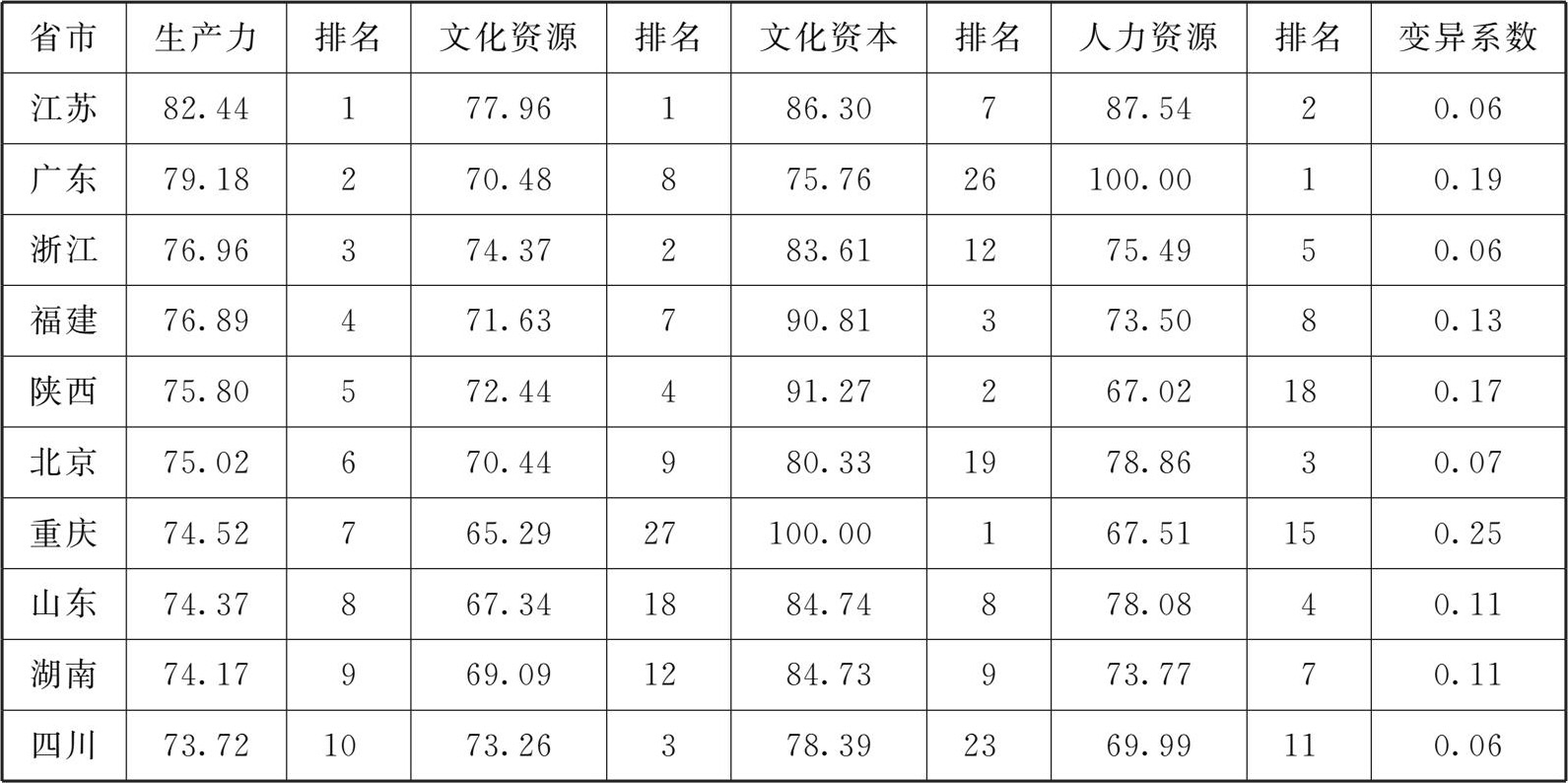 通过各地区生产力指数的变异系数可以看出,大部分省市文化产业生产力指数变异系数适中,均衡度较好。重庆、陕西等地区的文化资本相对于其他指标优势明显,直接拉动了生产力指数上升,但变异系数较大,发展相对更为不均衡。而江苏、浙江等东部地区省市的均衡度较高。