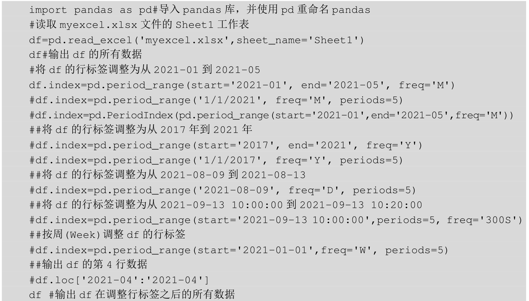 在上面这段代码中,df.index=pd.period_range(start='2021-01',end='2021-05',freq='M')表示在df中将行标签调整为从2021-01到2021-05,参数start='2021-01'表示起始月份,参数end='2021-05'表示结束月份,参数freq='M'表示以月份为单位。