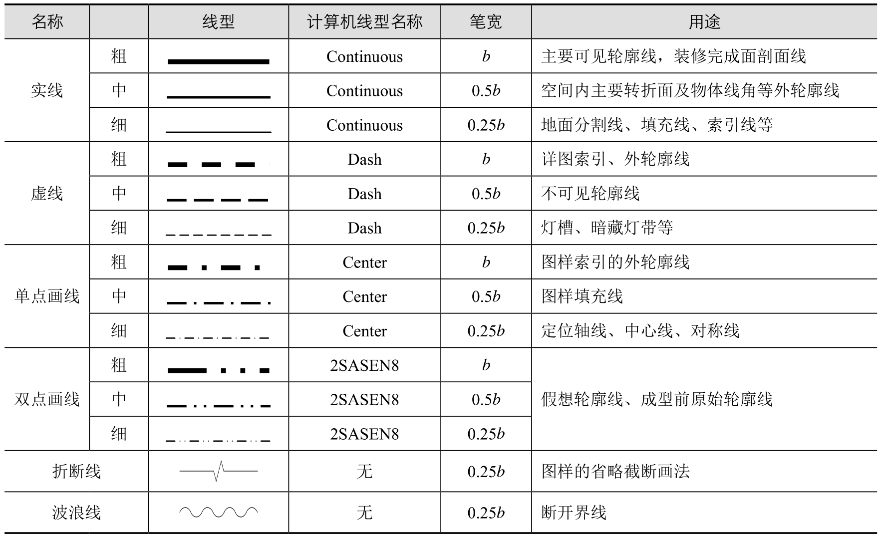 室内设计图中常用图线的名称、型式及用途如表2-3所示。