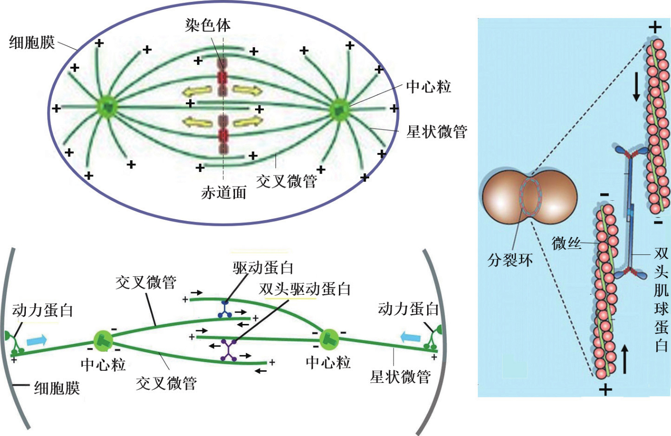 细胞两极的细胞膜上都结合有动力蛋白分子,它们在微管行走的脚会结合在星状微管上。这些动力蛋白向微管的负端即中心粒方向行走时,会把星状微管向细胞膜的方向拉,这样每个中心粒就被多根星状微管紧紧地拉在细胞的一极上(图3-14左下)。