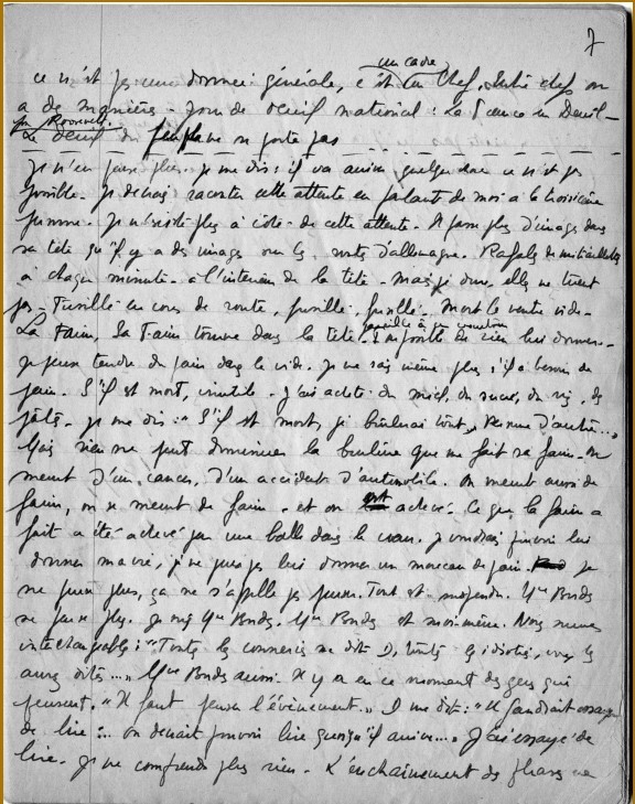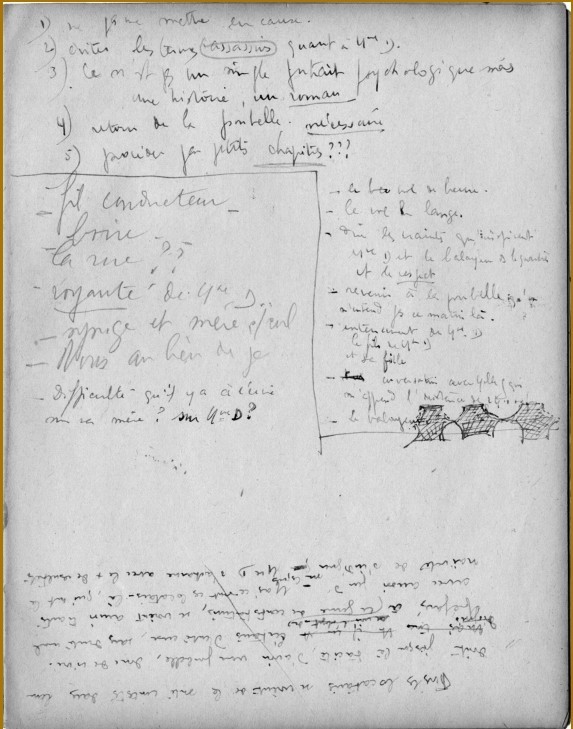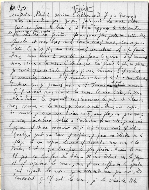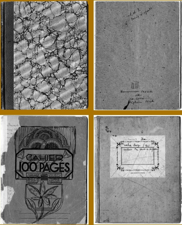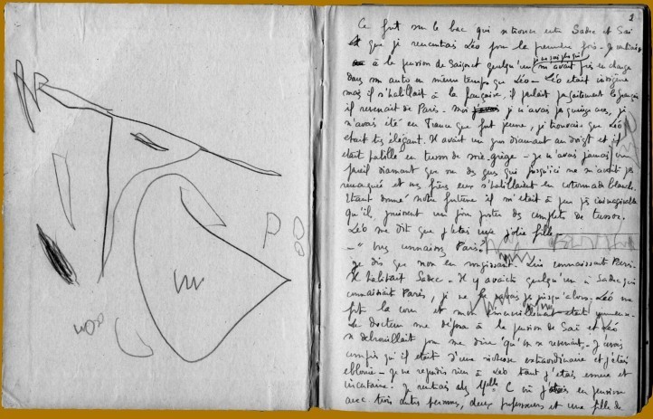 《玫瑰色大理石纹笔记》的第一页和第二页封面(第11—12页)。左图,一幅儿童的图画,很可能是玛格丽特·杜拉斯的儿子让·马斯克罗所画。