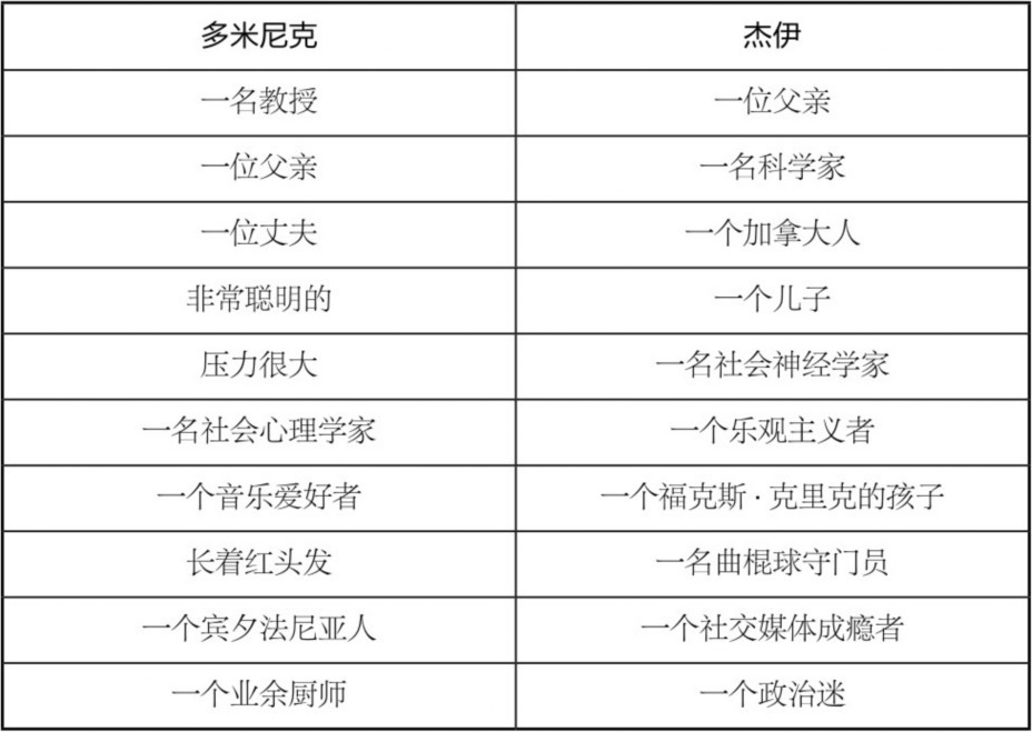 第二,大多数人的身份清单都包括可以归纳为某种类别的条目。有些很明显是关于自我的个人层面。聪明和乐观等表示稳定的性格特征以及像倍感压力这种更加临时性的状态显示的是一个人作为独特个体的方面。这些特征都是因人而异的。