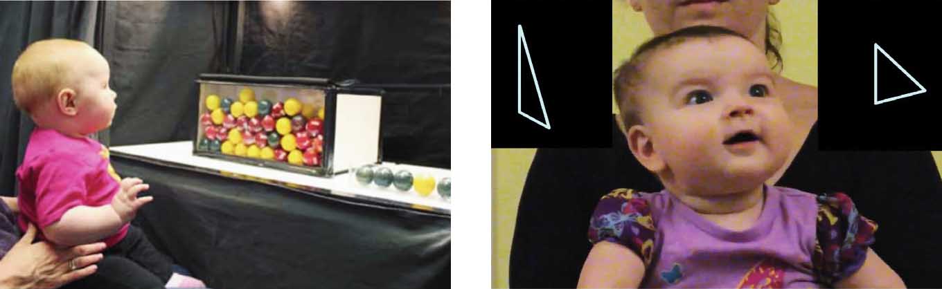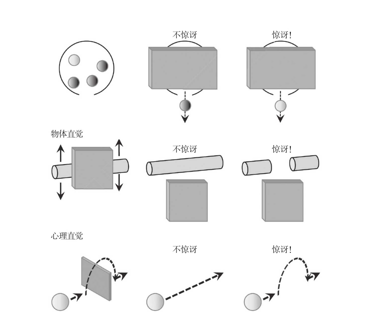 婴儿很早就拥有数学、物理学甚至心理学直觉。为了评估这些直觉,研究者进行实验并探究,相比一个不那么令他们惊奇的场景,婴儿是否对一个令他们惊奇的场景看得更久。当一个盒子里大部分是黑球时,婴儿会对拿出来一个白球感到惊讶(对数字和概率的直觉)。如果棒子的两端连贯地运动,婴儿会对揭示出有两根棒子感到惊奇(物体直觉)。如果婴儿看到一个自主移动的球,跃过了墙,跳到右侧,他们就会推测,这个球是有自主意识的生命体,他们也会对这个球离开墙壁后继续跳跃感到惊奇(心理直觉)。