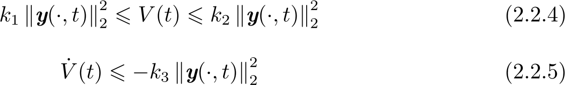定理2.1 (Lyapunov直接法-指数稳定性定理) 设 y (·, t )∈ D 为系统(2.2.1)~(2.2.3)的状态向量( D 是定义在 H 2 ([0, L ])上包含平衡态 y (·, t )=0的一个开子集)。对于∀ y (·, t )∈ D ,设连续可微函数 V ( t )≥0及其导数满足