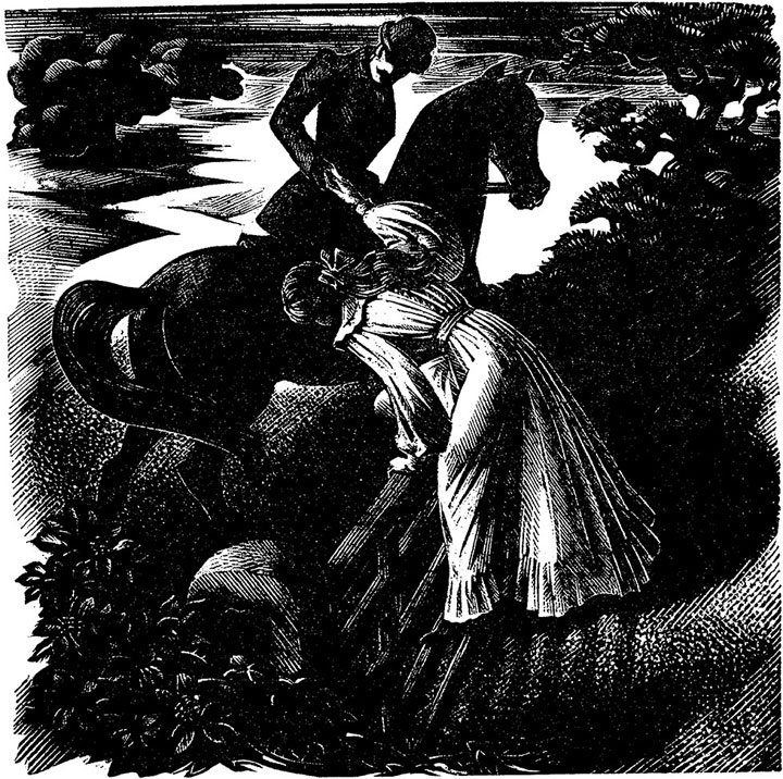 苔丝头脑极其清醒地意识到这是一个决定性时刻,因此差点儿晕了过去。对于亚历克这样主动给予援助,对于他如此相邀结伴,苔丝在任何别的时候几乎都会加以拒绝,就像在这之前她已拒绝过好几次一样;此时此刻,道路冷僻这一因素也没有自然而然地使苔丝改变以前的态度。只是因为亚历克的建议是在一个特别的紧要关头提出来的——面对着这些对手,苔丝只要纵身跳上马背,她的愤怒和害怕立刻就能变成胜利——所以她听凭自己一时冲动,攀上篱笆门,一只脚尖踮在亚历克的脚背上,爬到他身后,坐进马鞍里。等到那些喝多了酒的好斗的女人意识到发生了什么事情的时候,马儿已经驮着他们两人跑得老远,转眼就消失在苍茫夜色之中。
