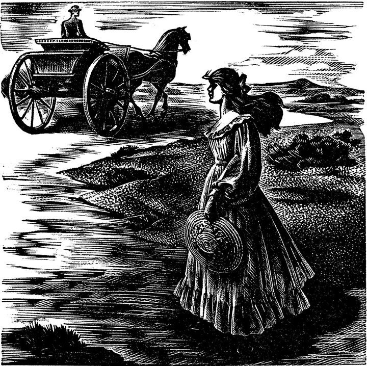 “那么,好吧,我放你下去——不过有一个条件。既然把你带到了这个人迹罕至的地方,我觉得自己有责任再把安全回家的路指引给你,不管你会怎么想。说到你打算不要我的帮助自己回特兰特里奇去,那是不可能做到的,因为,实话对你说,亲爱的,这么大的雾,弄得什么都看不清楚,连我自己也不知道我们是在什么地方。喏,要是你答应在马儿旁边等着我,让我去探路,穿过灌木丛,找到道路或者房子,确切地断定我们究竟是在什么地方,然后我将很乐意把你一个人丢下。等我回来以后,我会详详细细地告诉你该怎么走,到那时候如果你坚持要步行回家你可以那么做,要不然你也可以骑马回去——随你的便。”