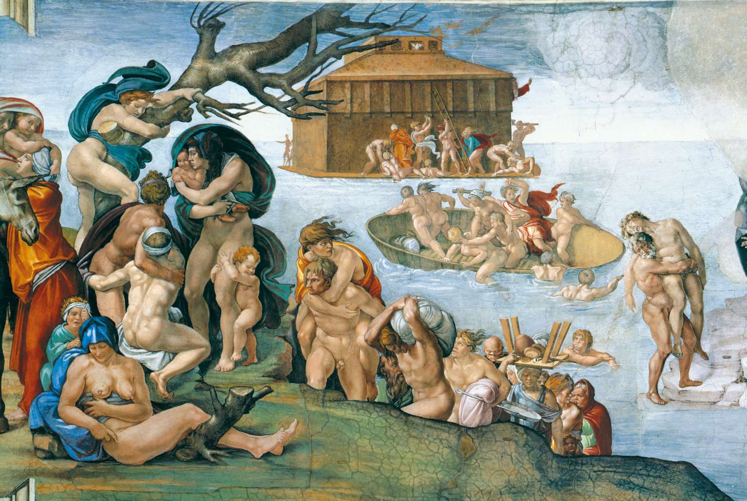 挪亚是第一个拯救了人类乃至世界生物的人。阳光在他猩红的长袍上变成了白色。他的三个儿子正在劳作,按照耶和华对挪亚的秘示建造方舟,以对付天谴的洪水。方舟像一个大木笼子,画面只能容下一小角,因为那里要装下全世界的动物。梵蒂冈是罗马的城中之城,是帝国中的天国,教皇的禁苑,那里收藏了许多古代无名画家的杰作。