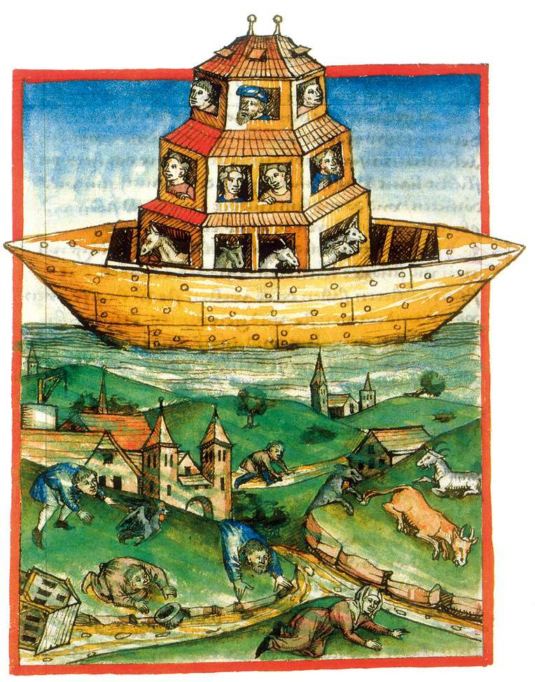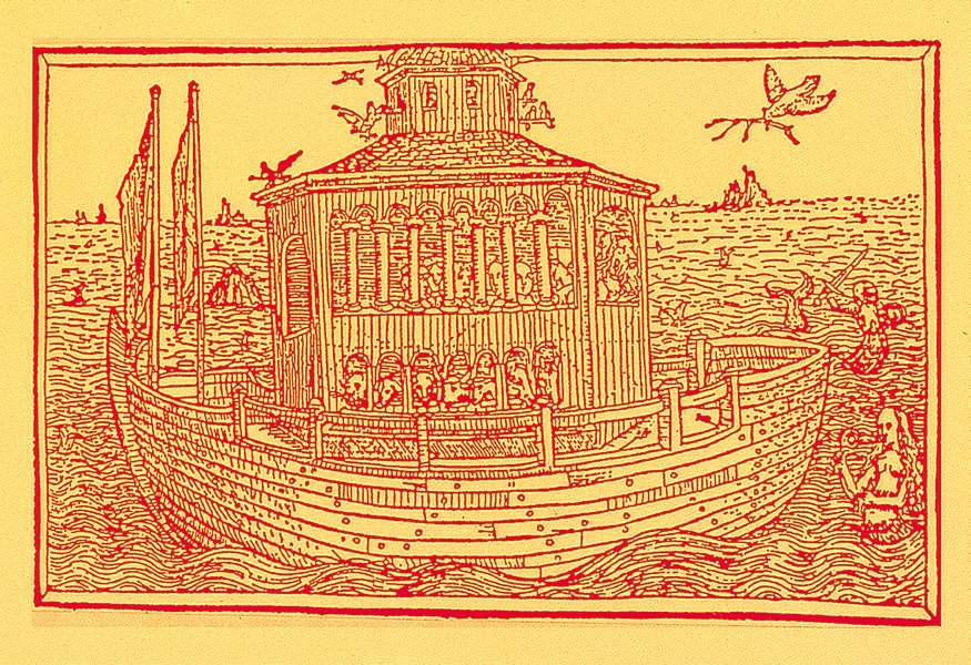彩色印刷术发明之前,木刻版画是大多数美术作品唯一的复制手段:因此拷贝化的复制概念常常与画面的思想主题相混淆。如这幅版画,挪亚一家人被整齐地排列在方舟上端的柱子之间,而动物则以同样的形式在下层码放。与其说这是一艘船,不如说是一栋海上的建筑。只有右下角神秘的魔鬼和空中衔回橄榄枝的鸽子,灵感式地指出这则神话中蕴涵的抽象美和“善者必获救”的寓意。