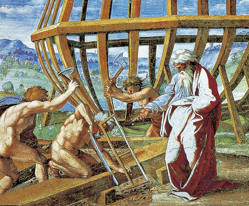 然而挪亚和他忠心耿耿的伙计们坚持工作。他们伐倒巨柏,用来做船的龙骨和船的两舷,并在上面抹上沥青,以保持底舱的干燥。等第三层甲板铺好以后,还造了一个顶篷。顶篷是用重木造成,以抵挡即将荡涤这个邪恶世界的暴雨。
