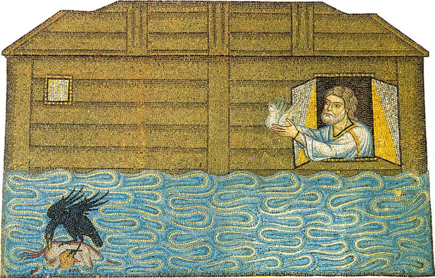 挪亚放出一只乌鸦,但它又飞了回来。接着他又放了一只鸽子。鸽子是飞得最远的鸟,但这可怜的小东西还是找不到可以落脚的枝桠,只好又飞回了方舟。挪亚逮住了鸽子,把它放回笼子。
