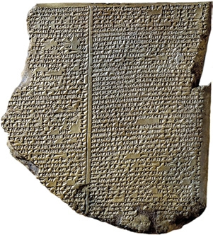 公元前7世纪的一位亚述国王建立了庞大的图书馆,把所收集和整理的古代传说记录下来。左图这块用楔形文字书写的泥板就来自这个图书馆,上面记录了吉尔迦美什的方舟故事。现存大英博物馆。