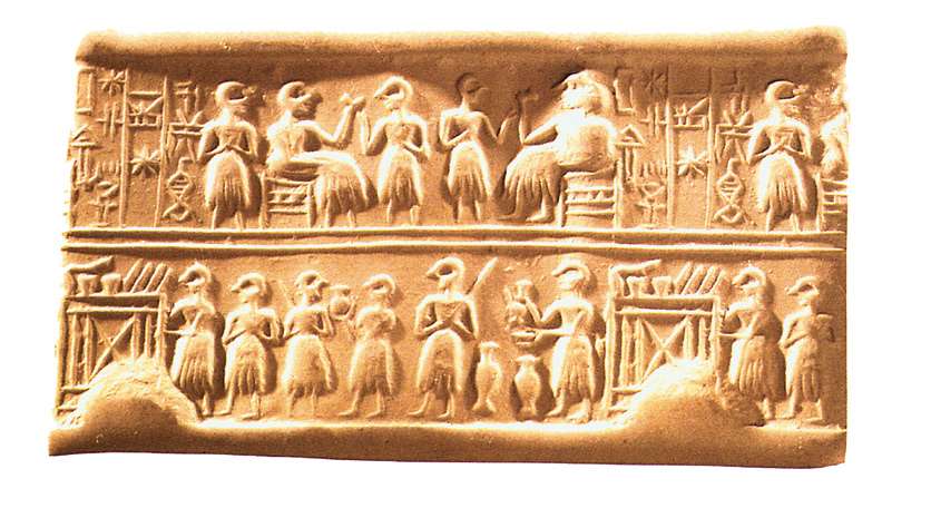 左图为公元前2035-前1650年埃及的墓室陶俑,表现了制作啤酒的场景。上图印章上的场面表现了苏美尔人饮用并用陶罐贮藏他们所喜爱的啤酒。