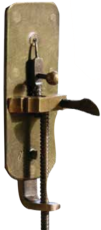 列文虎克显微镜的复制品。微型透镜在顶部附近,放在尖头支架上的样本可以通过钥匙状的旋钮聚焦。列文虎克还必须在合适的角度布置一个稳定的光源进行观察。