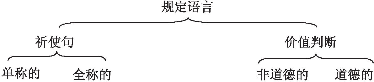 这种分类只是粗略的,在本书中我将逐步使它更精确一些。比如说,读者将会看到,日常语言中的所谓“全称祈使句”就不是严格意义上的全称语句。我也并不以为这种分类已经穷尽所有规定语言的种类,例如,单称祈使句和非道德的价值判断就有许多不同的类型,而且,除了单称祈使句和全称祈使句之外,还有其他类型的祈使句。但这种分类已足以让我们着手研究并说明本书的计划。