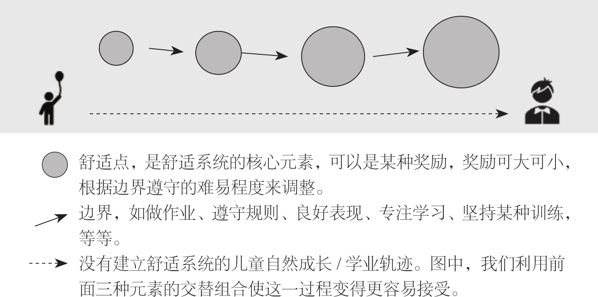 而无论是边界遵守还是奖励享受,这两者都必须在灰色方框区域内,也就是两者都是建立在对孩子天性的接受和支持上的。也就是说,建立这个舒适系统的最终目的,是让孩子能够最大限度地享受整个过程,并得到好的结果。