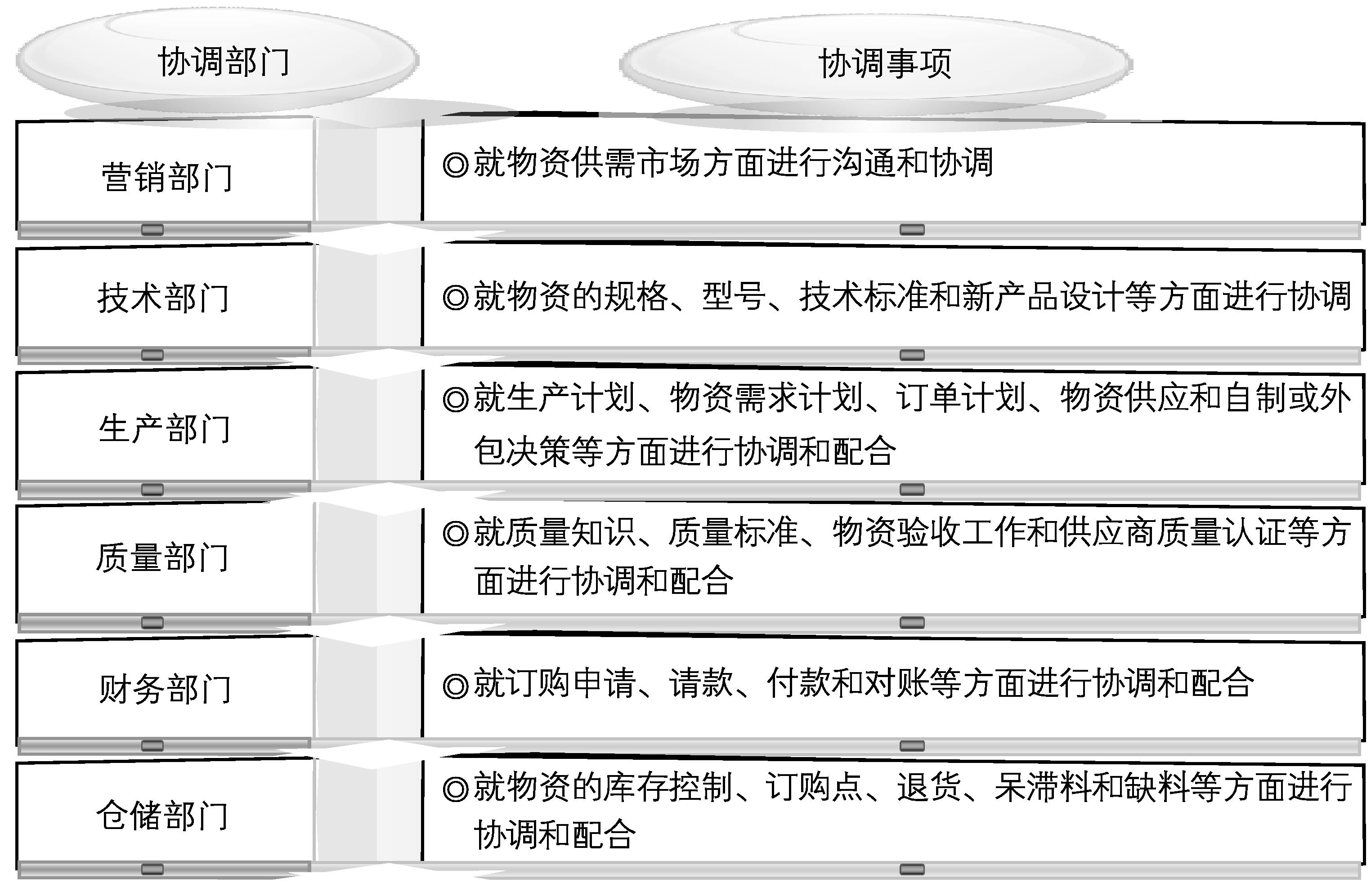 组织协调能力是指采购人员对于组织内、外部产生的不和谐行为,通过沟通和协调发现隐藏问题或矛盾,提出相应的解决方法或应对策略,并与企业内、外部人员达成某种共识的能力。采购人员在开展采购业务的过程中,需要协调的部门与事项如图1-4所示。