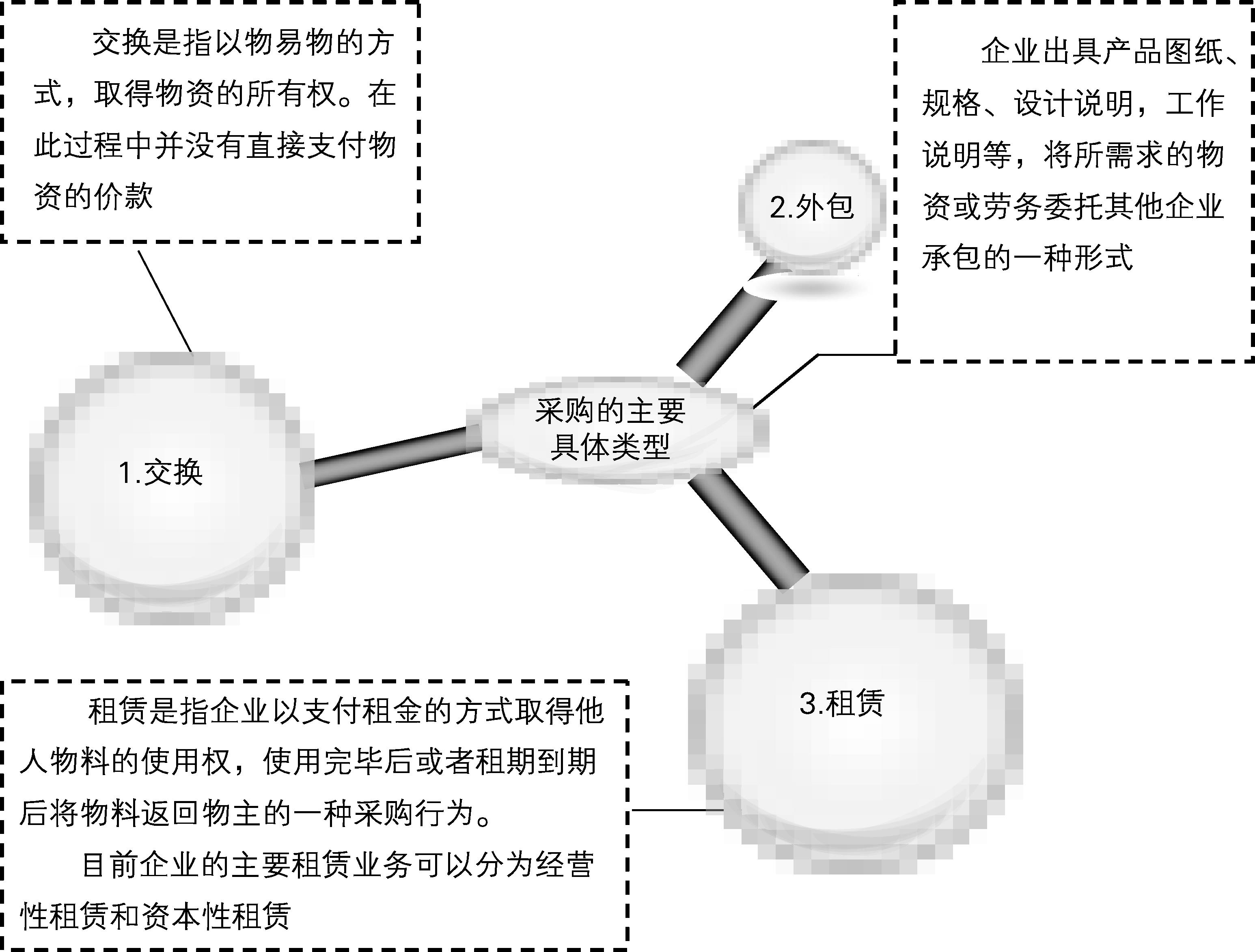 ①采购的类型。从狭义上讲,采购就是由买方支付相应款项,从卖方获取物品或服务的行为,但从广义上来讲,采购还包括租赁、交换、外包、征收等形式,采购的主要具体类型示意图如图1-2所示。