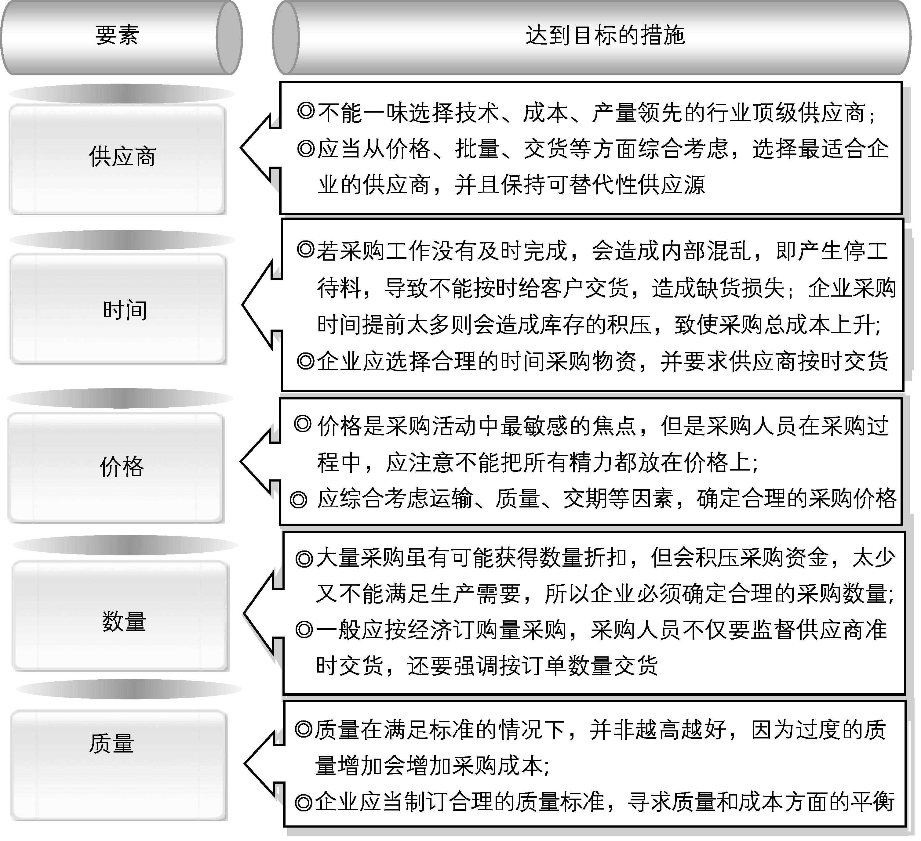 采购的5大要素包括供应商、质量、价格、时间和数量。采购过程中必须遵循5R原则,即从“合格的”供应商(Right Supplier)手中,在“合理的”时间(Right Time)内,以“合理的”价格(Right Price)取得正确的数量(Right Quantity)和符合品质(Right Quality)要求的物料与服务。