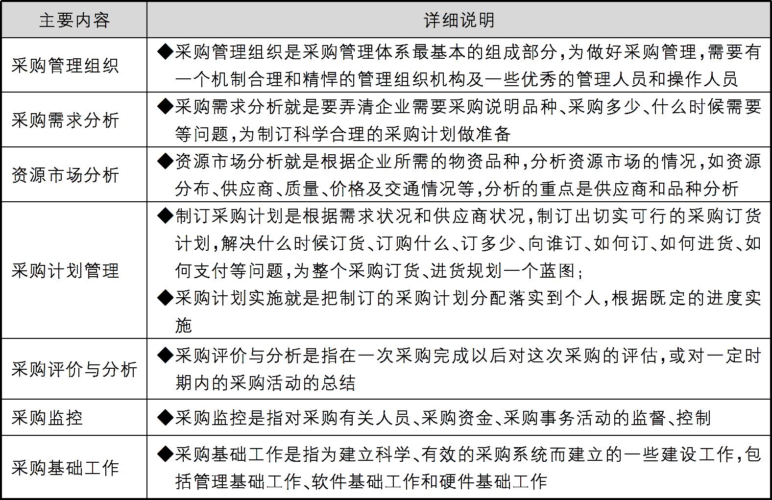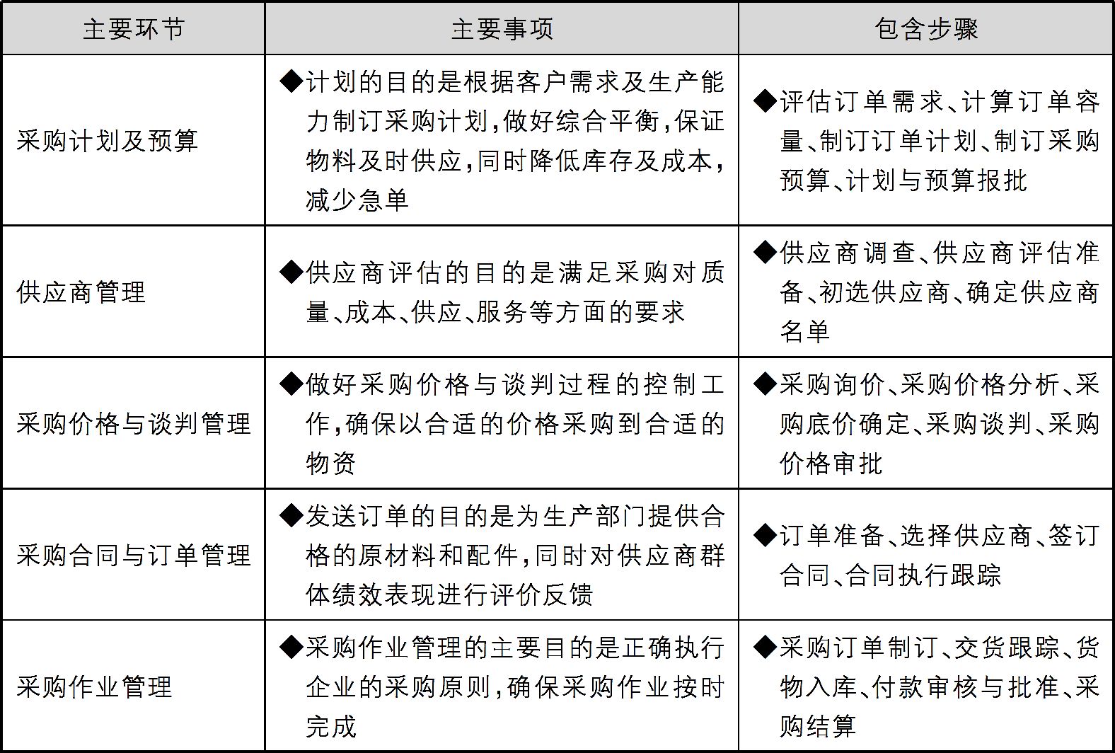 采购过程可划分为5大环节,每个环节中又包含了若干的步骤,采购过程主要环节说明表如表1-3所示。