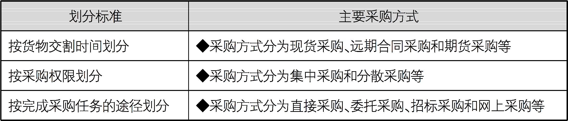 根据不同的划分标准,采购方式有很多种,采购方式说明表如表1-2所示。