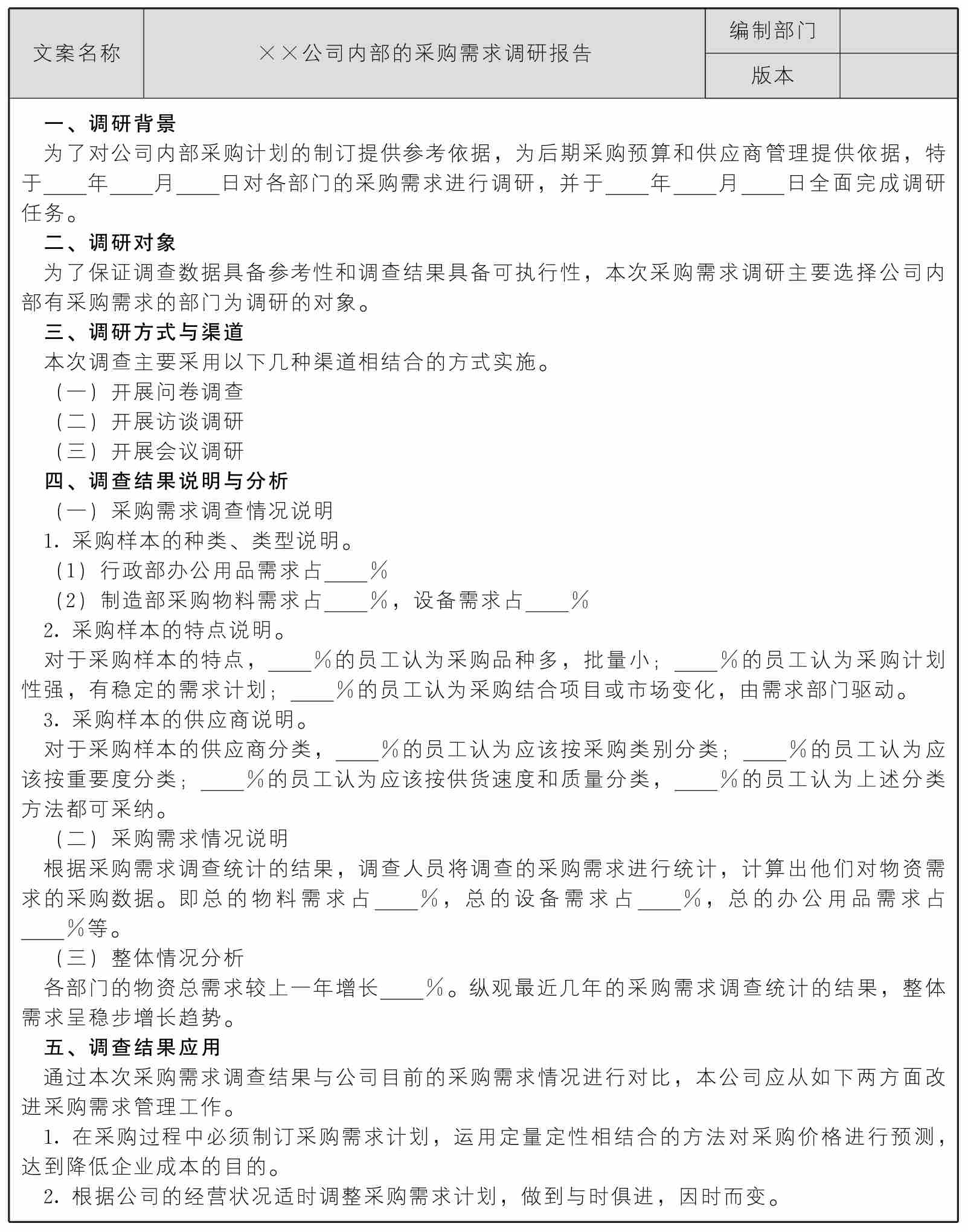 采购需求是指对采购标的物的特征描述。要实施采购就一定要认清楚采购需求,好的采购需求能够合理、客观地反映采购标的物的主要特征以及符合供应商响应的条件,满足适用原则、非歧视原则,并能够契合市场实际。