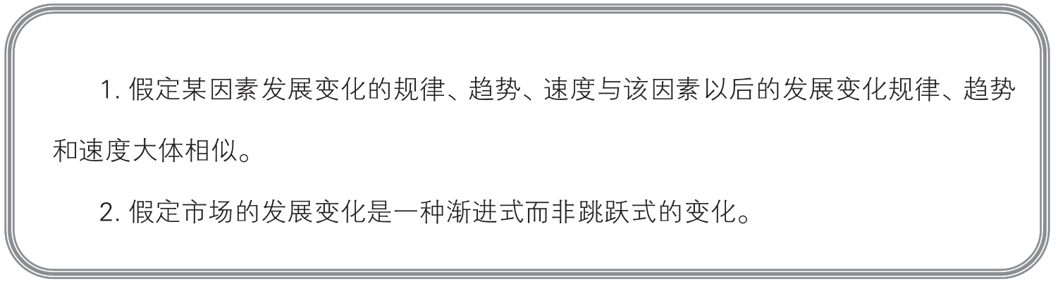 时间序列预测法是一种统计分析方法,根据一定时间的数据序列预测未来发展趋势的方法。采用这一方式进行采购需求预测,需符合一个假设的前提,假设前提见图1-4。