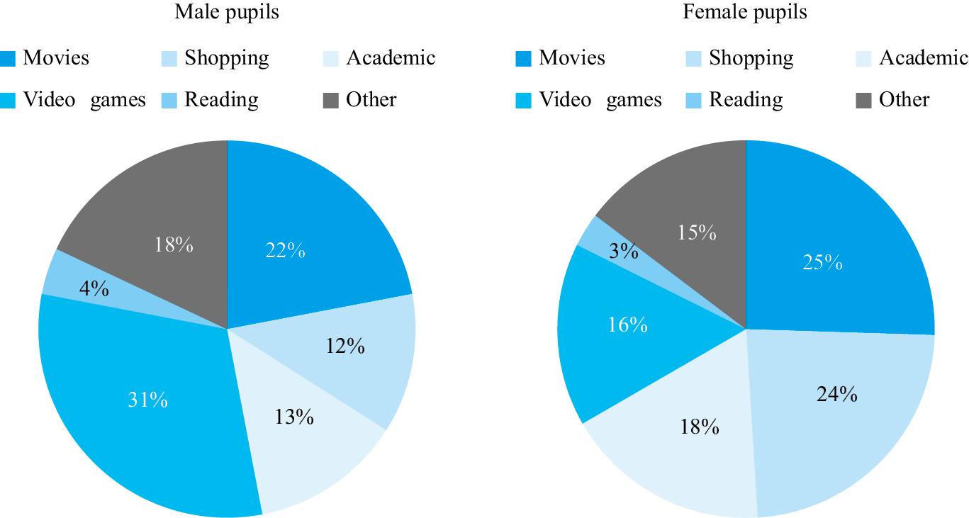 Amongst male pupils, playing video games is the most time-consuming activity, at 31%, almost double the figure for female pupils, at 16%. However, the proportions are reversed in the case of online shopping, which males only spend 12% of their time doing, whereas double the number of female pupils do this, 24%. The other differences between the genders are less dramatic.