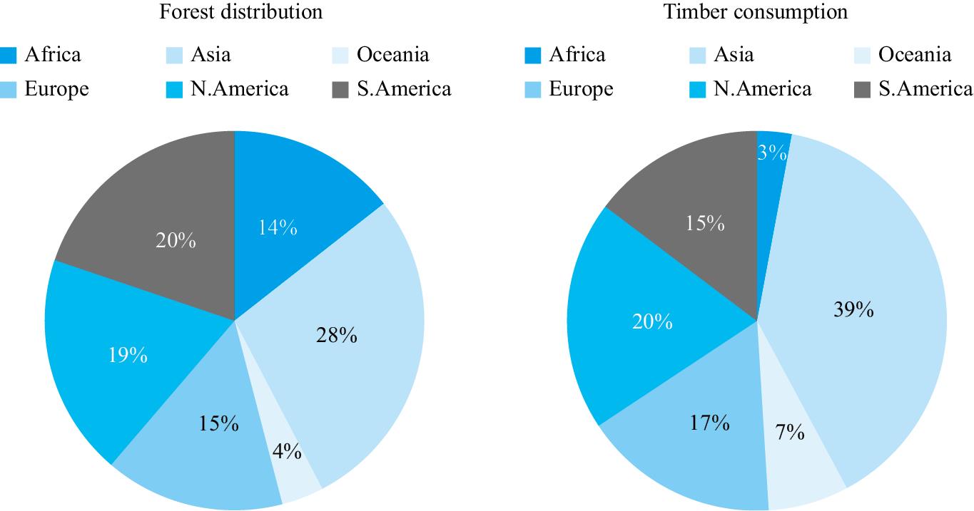 The two charts show the locations of forests throughout the world by continent, and the percentage of world timber consumption in each part of the world. We can see clearly that there is a basic balance between forest cover and consumption, although some areas produce more than they consume, while others consume more than they produce.
