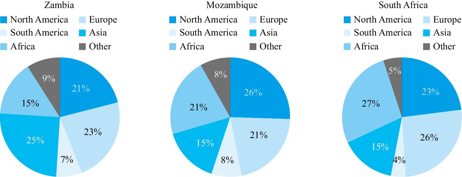 Destination of exports from EU countries to six continents in 2000 and 2017