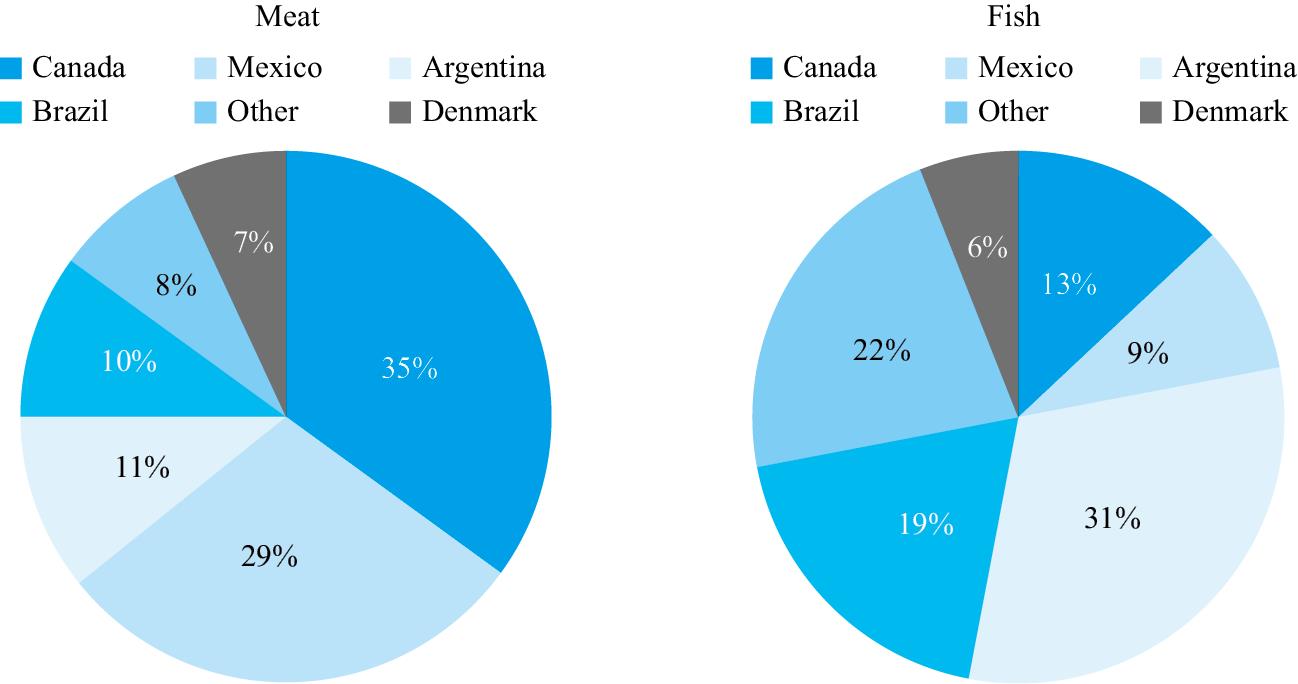 In most cases, there are dramatic differences between the two sets of suppliers. Mexico supplies 20% less fish than meat, whereas for Argentina the figure is reverse [8] , supplying 20% more of the fish requirements. Brazil supplies almost double the percentage of US fish requirements compared to those for meat.