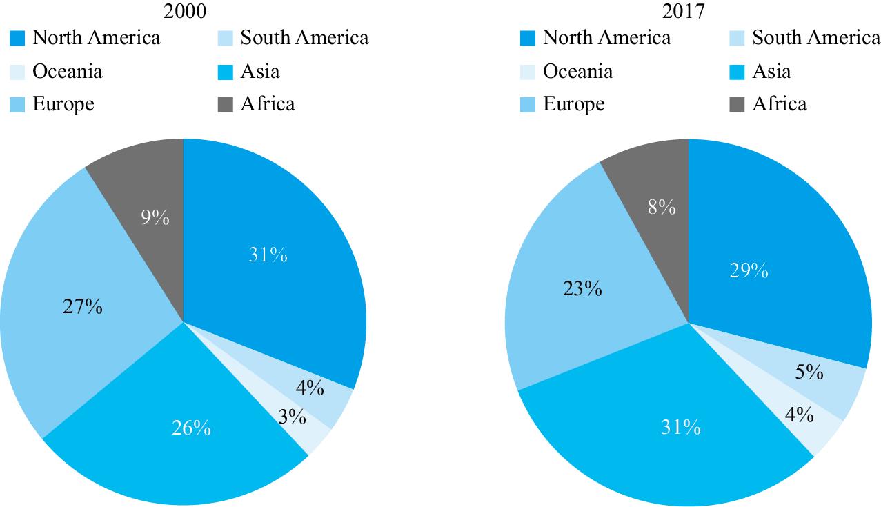 Looking first at continents to which exports declined, we can see that the amount of goods sent to North America remained roughly stable, at 31% in the year 2000, decreasing marginally to 29% in 2017. A similar picture can be seen in relation to exports to Africa, which declined from 9% to 8%. Trade within Europe also fell slightly, from 27% to 23% over the 17 years.