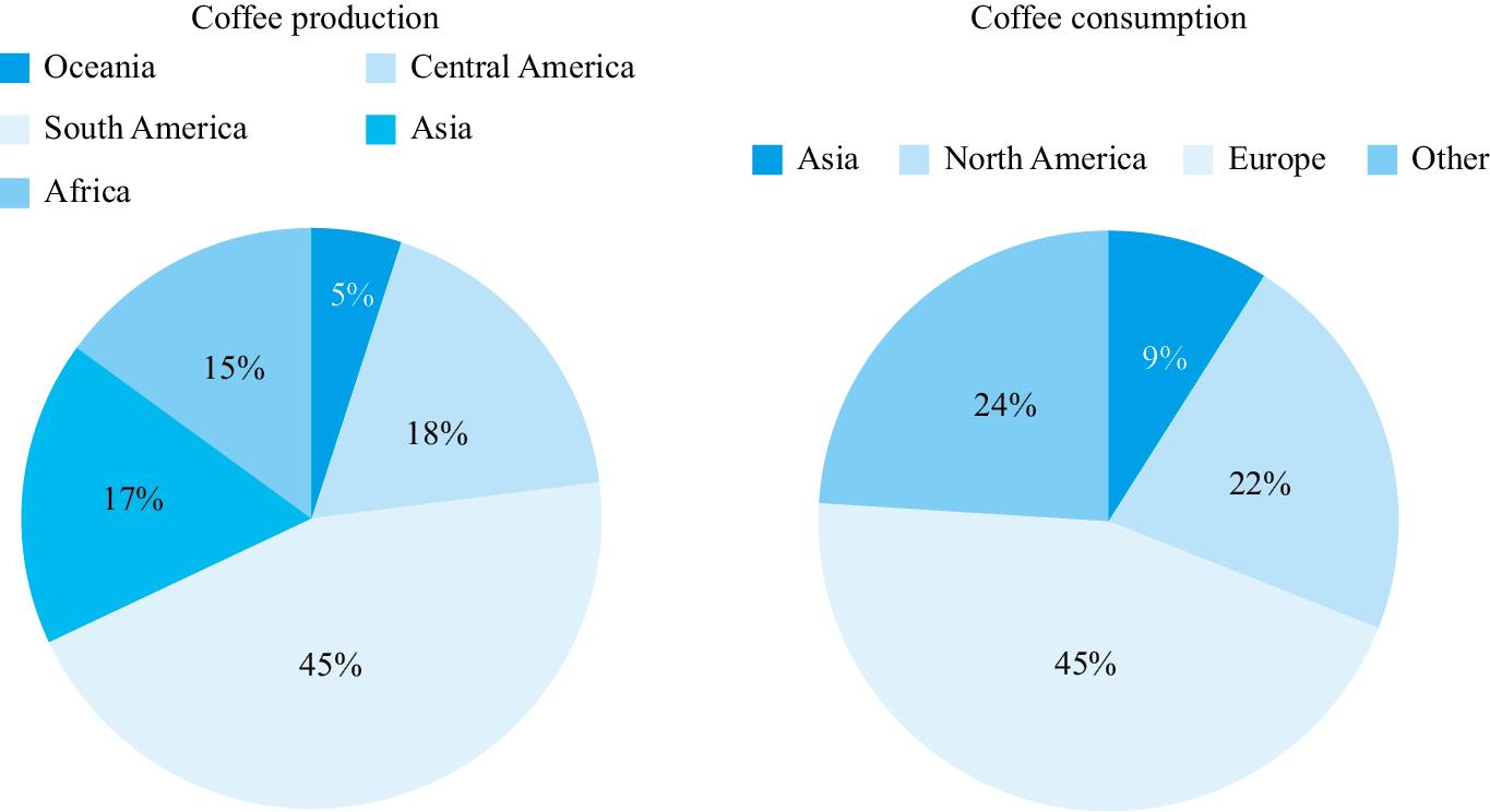 The two bar charts provide information about where coffee is produced, and where it is consumed. It is clear that while production comes largely from Asia, Africa, and South and Central America, consumption takes place elsewhere, principally in Europe, North America and Asia.