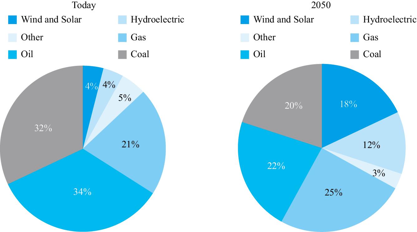The charts show how energy is currently produced in the USA, and predicts changes until 2050. It is clear that, while energy generation now relies overwhelmingly on fossil fuels, a far higher proportion of renewable energy is predicted to be used in 2050.