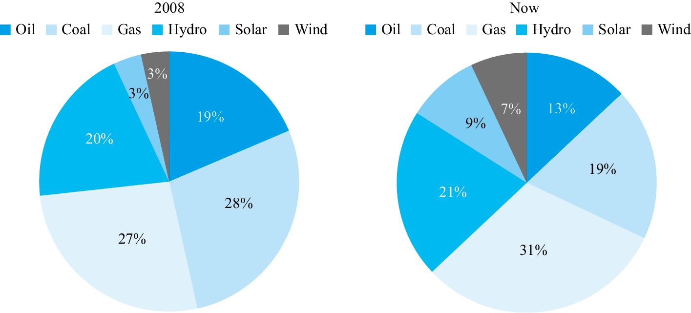 However, the situation today has changed markedly. The proportion of power generation from renewable energy has risen sharply from 26% overall to 37%. Although there has only been a slight increase in power supplied from hydroelectricity, from 20 to 21%, the amount generated by solar and wind power has more than doubled from 3% for both sources to 9% and 7% respectively. Amongst fossil fuels, the amount of power generated by gas has increased slightly from 27% to 31%, while that provided by burning oil has declined by 6%. The most significant decline has been that of coal, which fell by 9%, from 28% to 19%.